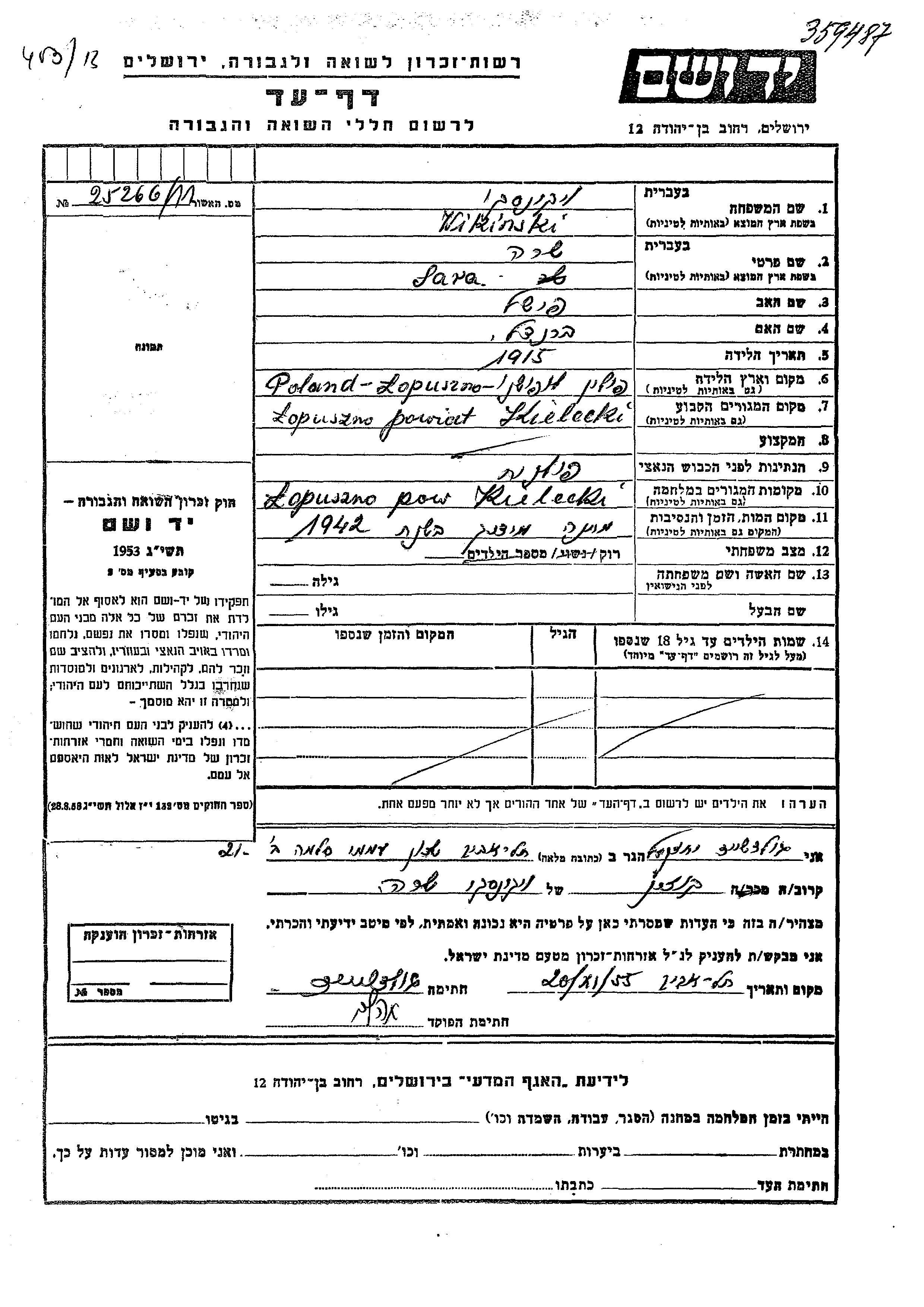 Sara Wikinski wurde im Jahr 1915 in Lopuszno, Polen geboren. Sie war die Tochter von Fishel und Brandel. Sie war Ledig. Vor dem Zweiten Weltkrieg lebte sie in Lopuszno, Polen. Während des Krieges war sie in Lopuszno, Polen.