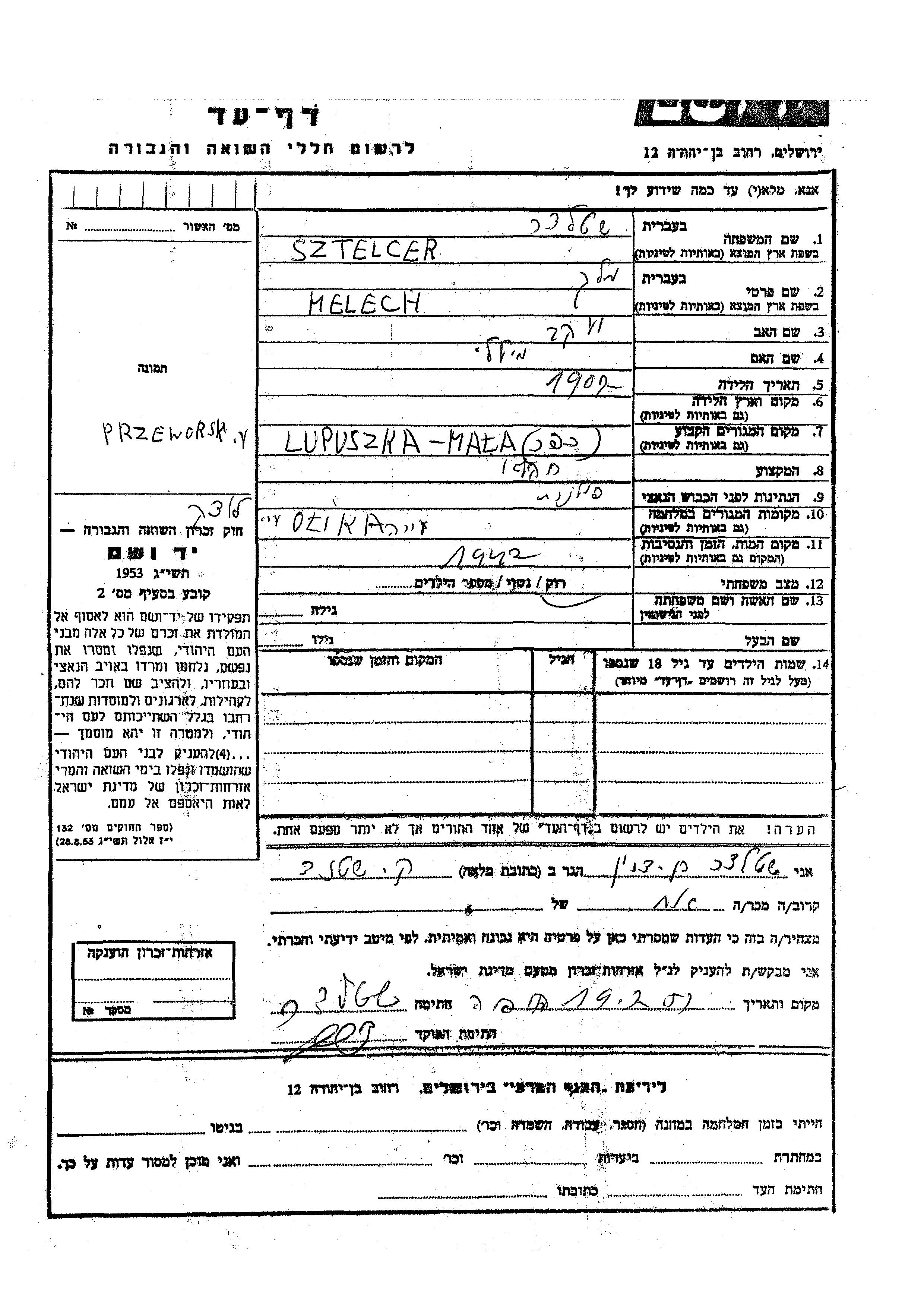 Melech Sztelcer wurde im Jahr 1909 geboren. Er war der Sohn von Yaakov und Matilda. Er war Landwirt und Ledig. Vor dem Zweiten Weltkrieg lebte er in Lopuszko, Polen. Während des Krieges war er in Olika, Polen.