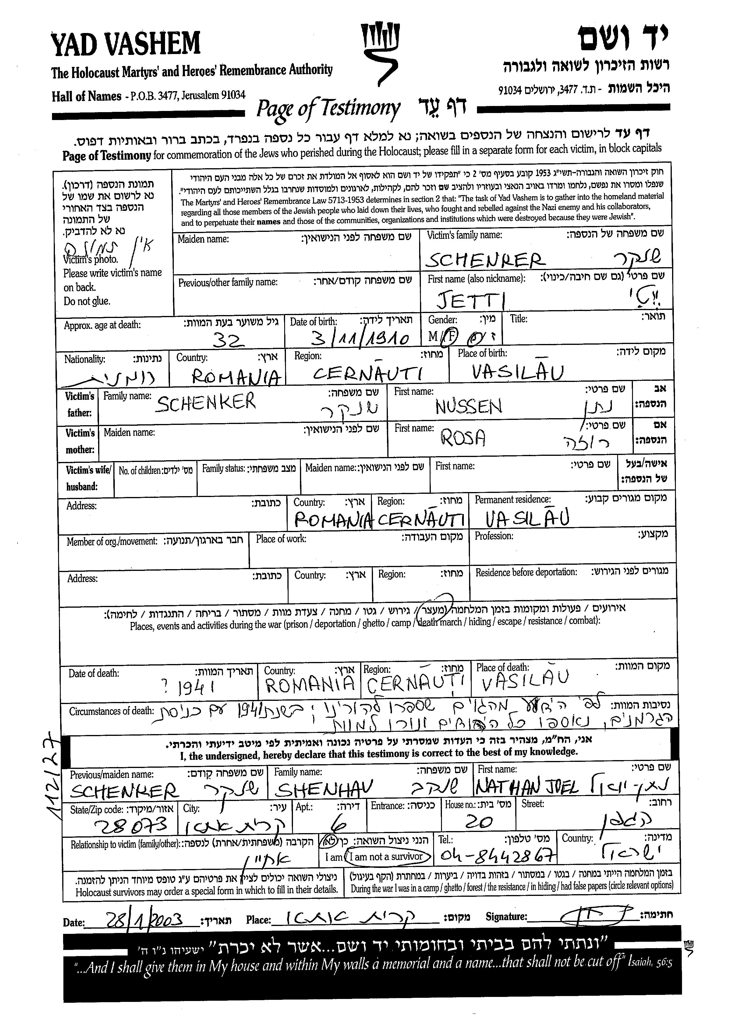 Ieti wurde in der Schoah ermordet. Todesort: Vasilau, Rumänien im Jahr 1941.