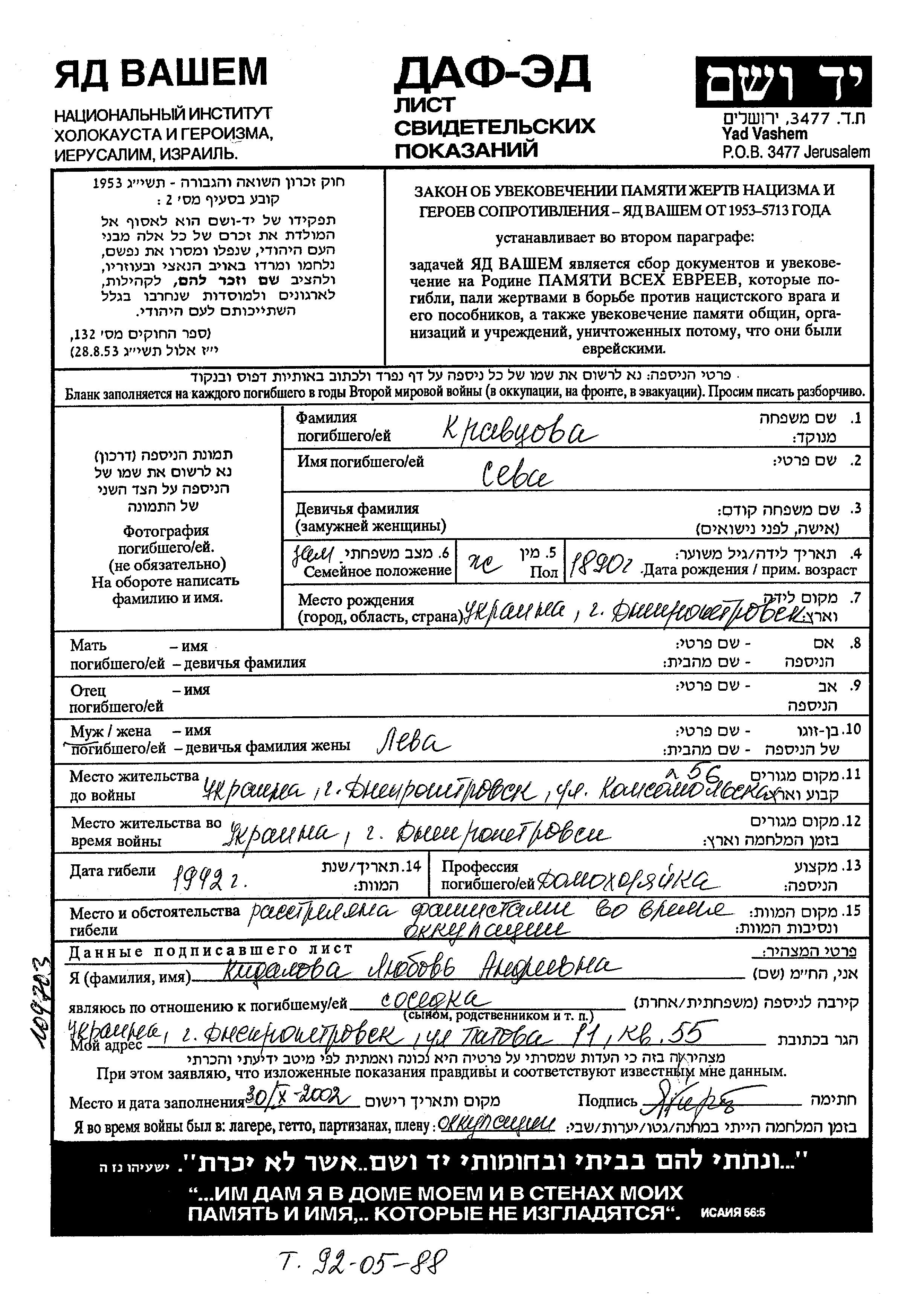 Seva Kravtzova wurde im Jahr 1890 in Dnepropetrovsk, Ukraine (UdSSR) geboren. Sie war Hausfrau und mit Leva Verheiratet. Vor dem Zweiten Weltkrieg lebte sie in Dnepropetrovsk, Ukraine (UdSSR). Während des Krieges war sie in Dnepropetrovsk, Ukraine (UdSSR).