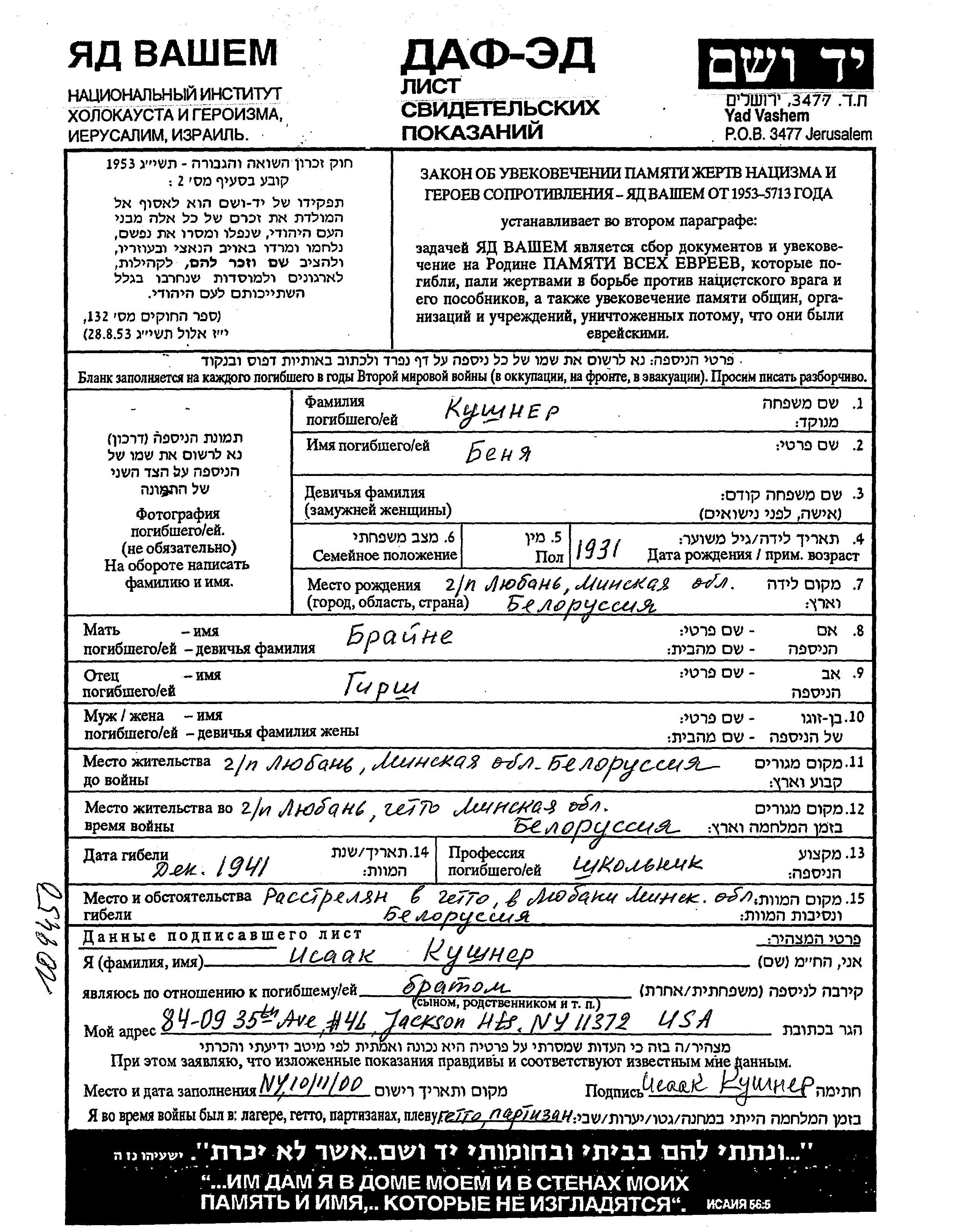 Benya Kushner wurde im Jahr 1931 in Lyuban, Weißrussland (UdSSR) geboren. Er war der Sohn von Girsh und Brayne. Er war Schuljunge. Vor dem Zweiten Weltkrieg lebte er in Lyuban, Weißrussland (UdSSR). Während des Krieges war er in Lyuban, Weißrussland (UdSSR).