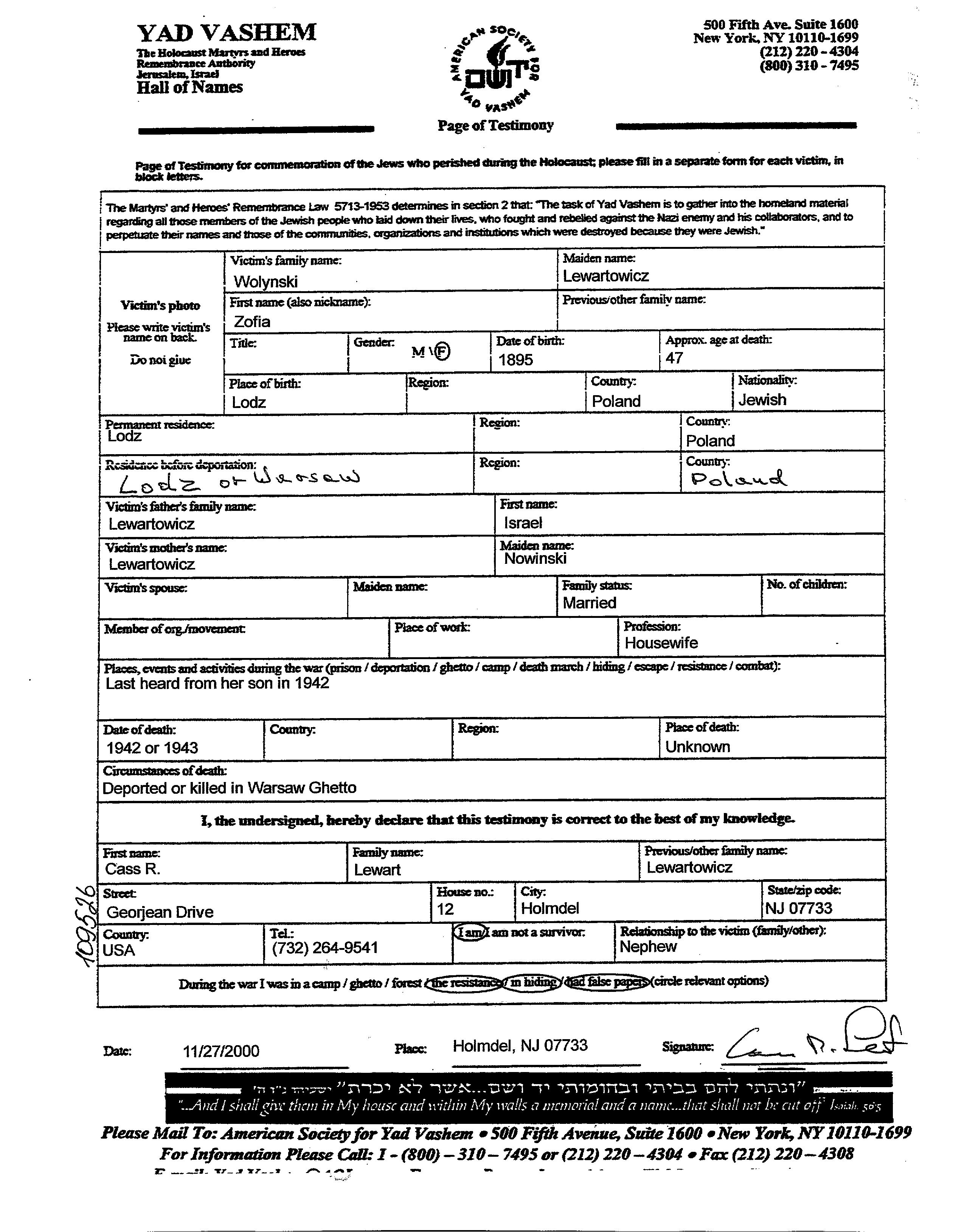 Zofia Wolynski, geb. Lewartowicz wurde im Jahr 1895 in Lodz, Polen geboren. Sie war die Tochter von Israel, geb. Nowinski. Sie war Hausfrau und Verheiratet. Vor dem Zweiten Weltkrieg lebte sie in Lodzh, Polen. Während des Krieges war sie in Warszawa, Polen.