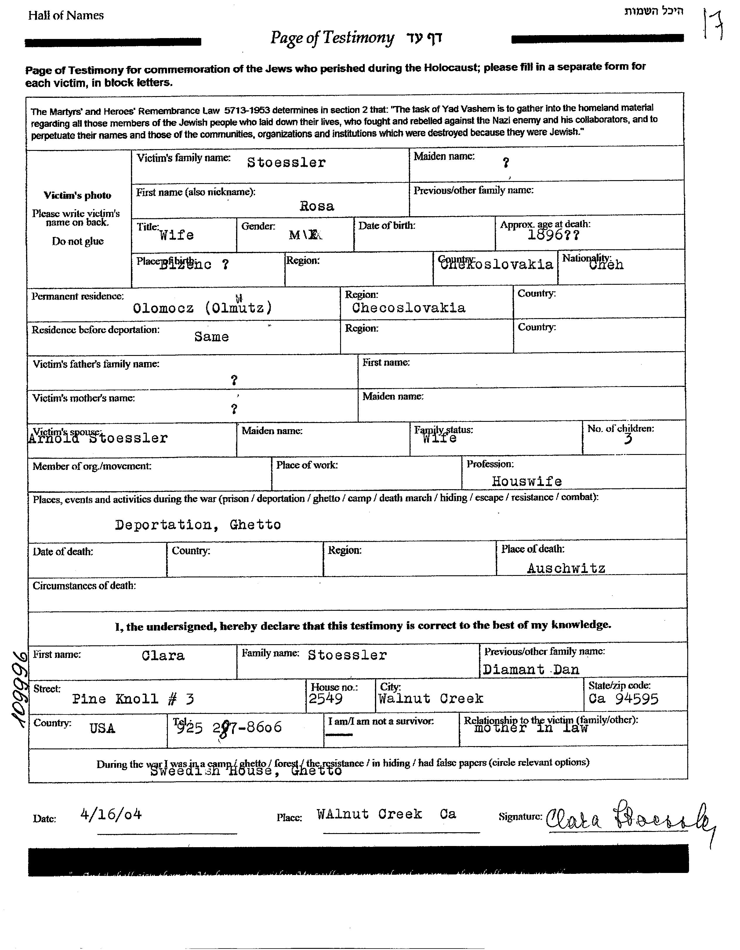 Rosa Stoessler wurde im Jahr 1896 in Bizenz, Tschechoslowakei geboren. Sie war Hausfrau und mit Arnold Verheiratet. Vor dem Zweiten Weltkrieg lebte sie in Olomouc, Tschechoslowakei. Während des Krieges war sie in Olomouc, Tschechoslowakei.