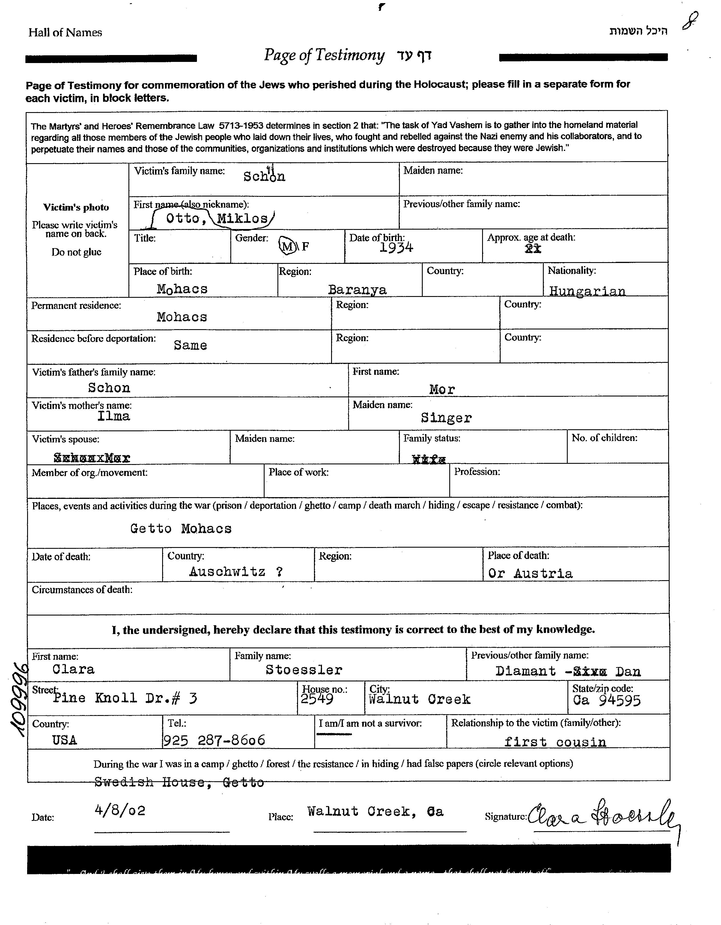Miklos Otto Schon wurde im Jahr 1934 in Mohacs, Ungarn geboren. Er war der Sohn von Mor und Ilma, geb. Singer. Vor dem Zweiten Weltkrieg lebte er in Mohacs, Ungarn. Während des Krieges war er in Mohacs, Ungarn.