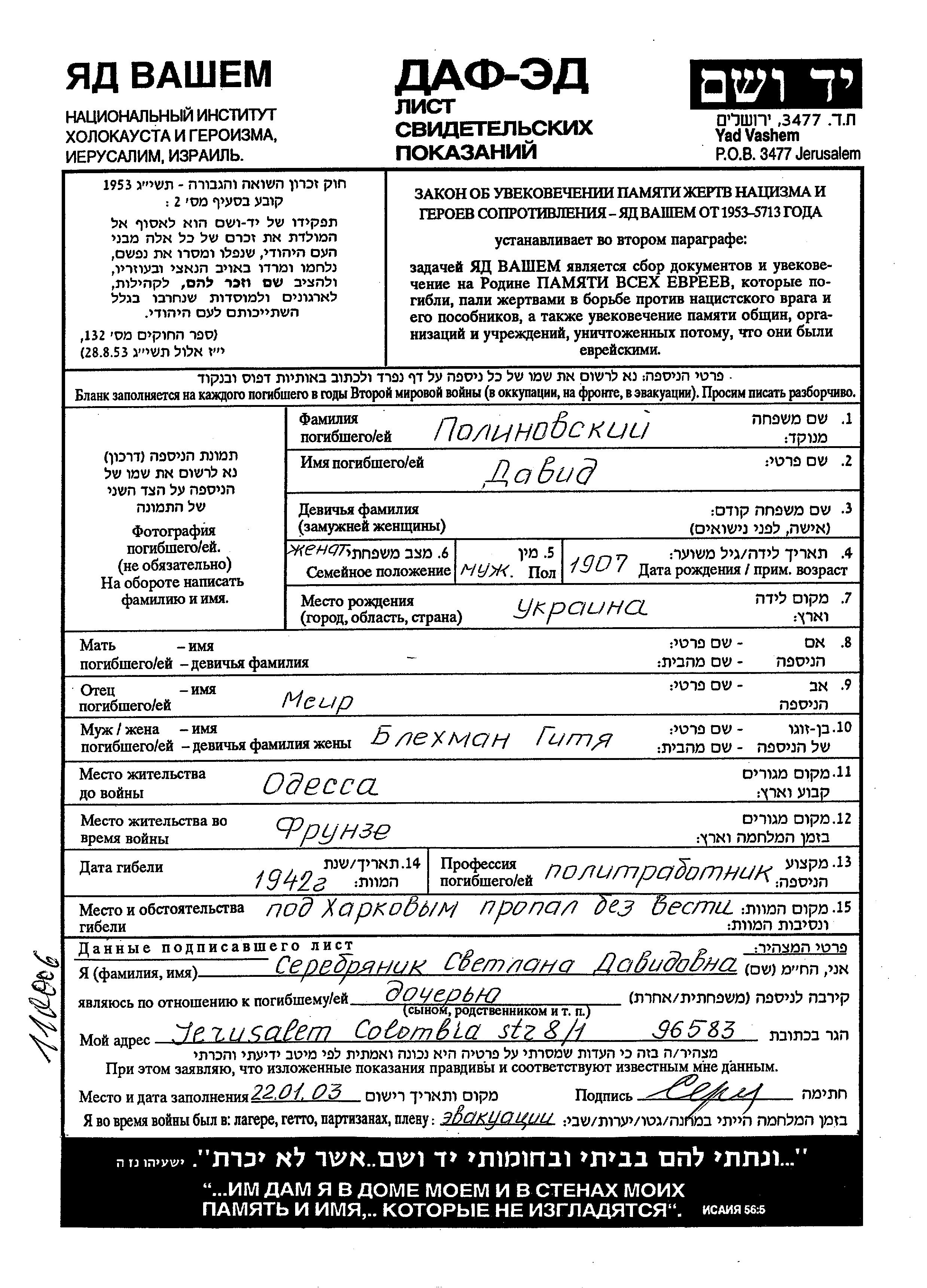 David Polinovski wurde im Jahr 1907 in Ukraine (UdSSR) geboren. Er war der Sohn von Meir. Er war Politoffizier und mit Gitya, geb. Blekhman Verheiratet. Vor dem Zweiten Weltkrieg lebte er in Odessa, Ukraine (UdSSR). Während des Krieges war er in Frunze, Sowjetunion.