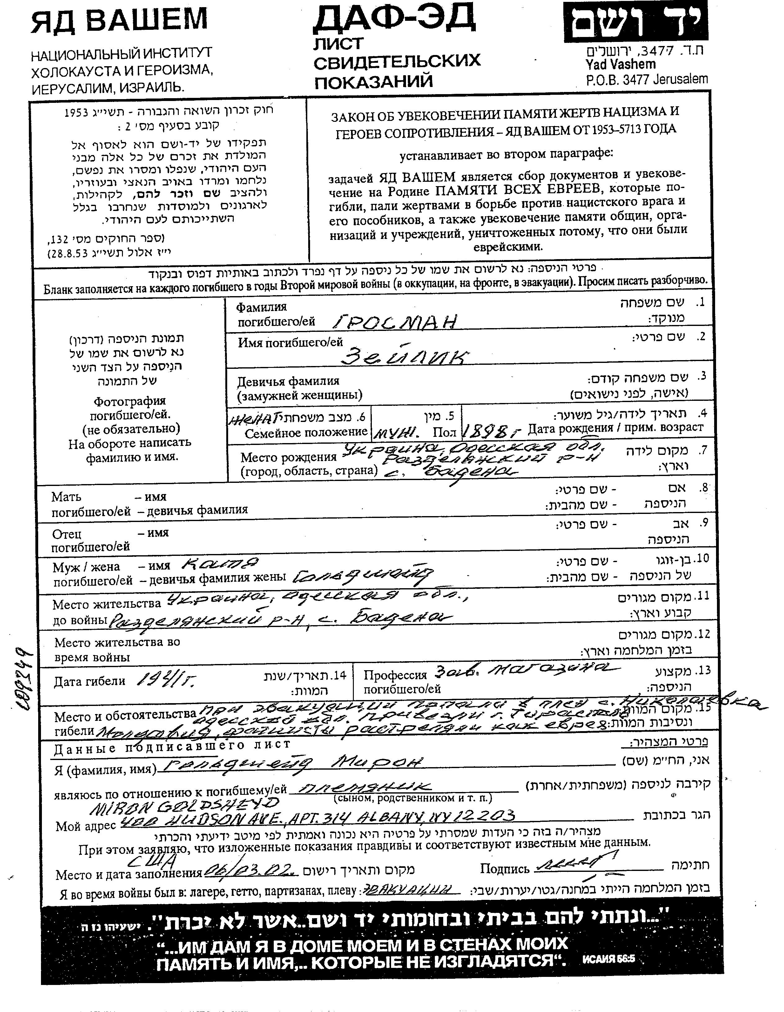 Zeilik Grosman wurde im Jahr 1898 in Badena, Ukraine (UdSSR) geboren. Er war Leiter eines ladengeschäfts und mit Katya, geb. Goldsheid Verheiratet. Vor dem Zweiten Weltkrieg lebte er in Badena, Ukraine (UdSSR). Während des Krieges war er in Tiraspol, Ukraine (UdSSR).