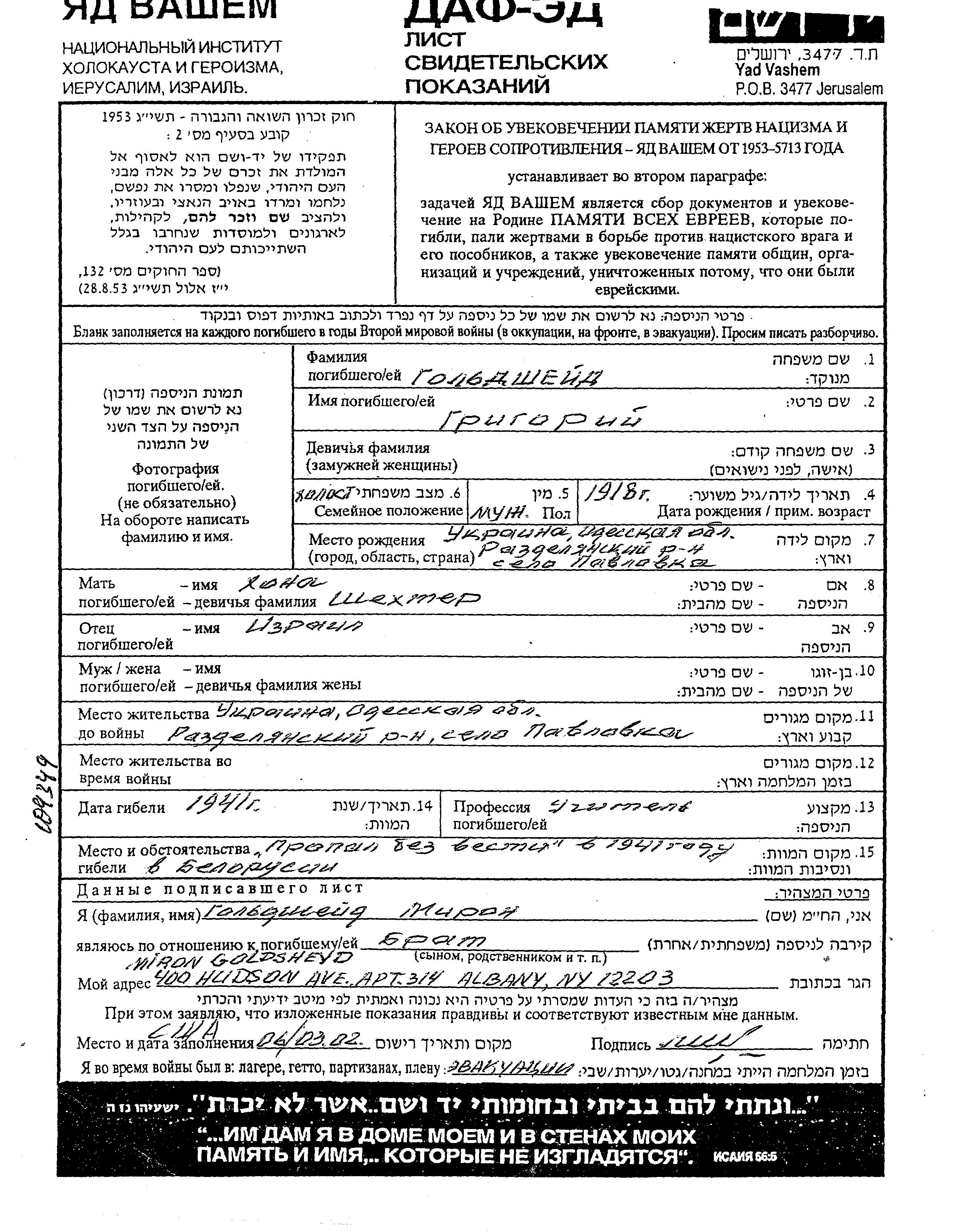 Grigori Goldsheid wurde im Jahr 1918 in Pavlovka, Ukraine (UdSSR) geboren. Er war der Sohn von Izrail und Khona, geb. Shekhter. Er war Lehrer/in. Vor dem Zweiten Weltkrieg lebte er in Pavlovka, Ukraine (UdSSR).