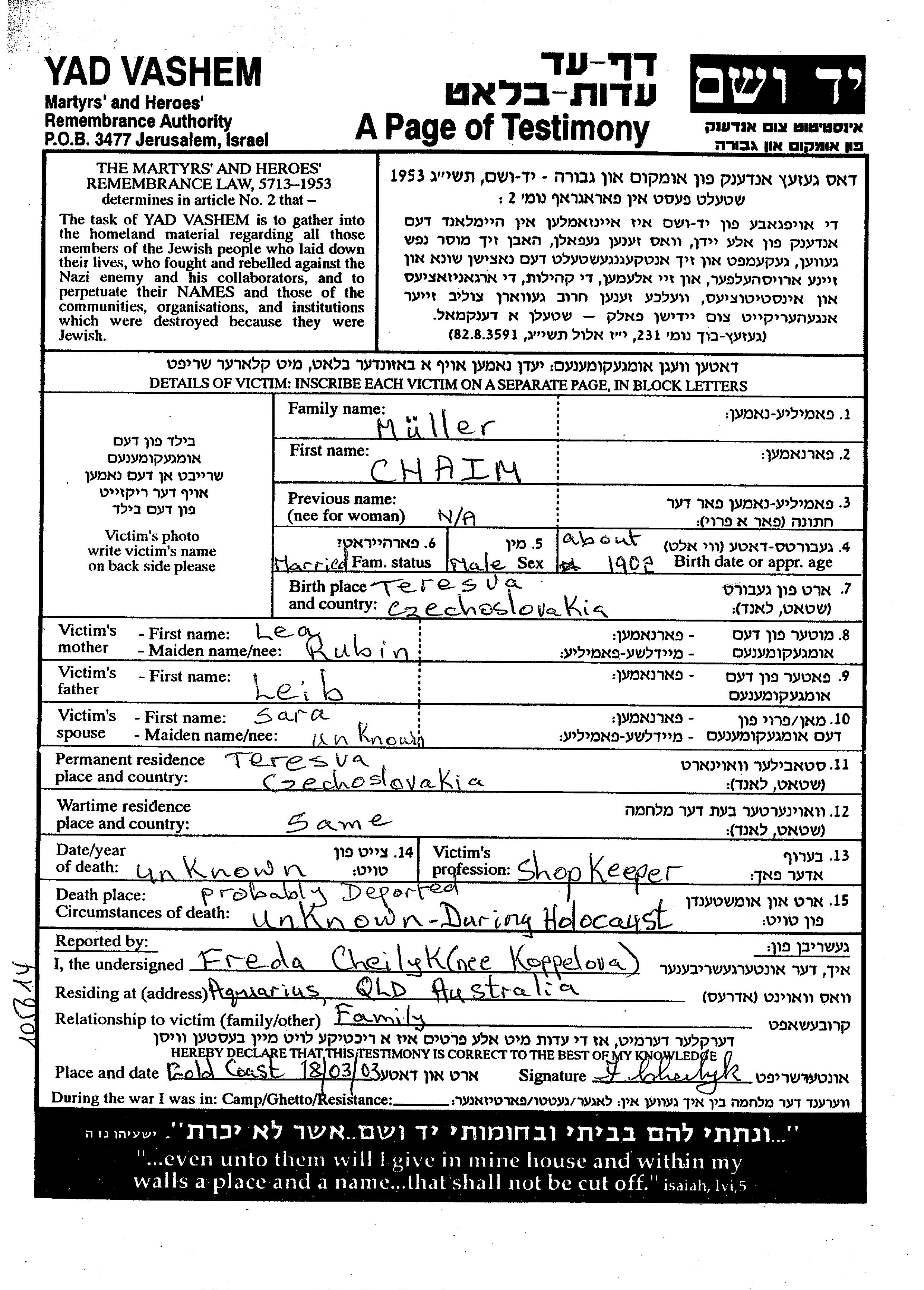 Chaim Muller wurde im Jahr 1902 in Teresova, Tschechoslowakei geboren. Er war der Sohn von Leib und Lea, geb. Rubin. Er war Ladenbesitzer/-in und mit Sara Verheiratet. Vor dem Zweiten Weltkrieg lebte er in Teresova, Tschechoslowakei. Während des Krieges war er in Teresova, Tschechoslowakei.