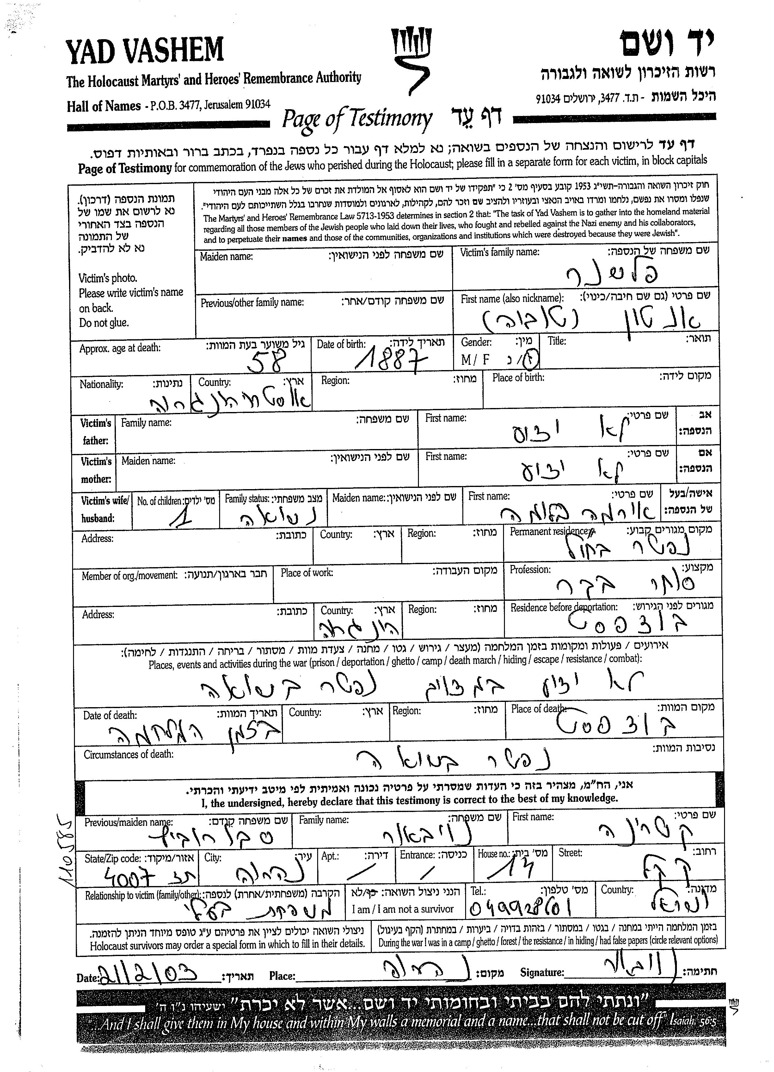Tuvia Anton Fleshner wurde im Jahr 1887 in Österreich-Ungarn geboren. Er war Viehhändler und mit Irma Bluma Verheiratet. Während des Krieges war er in Budapest, Ungarn.