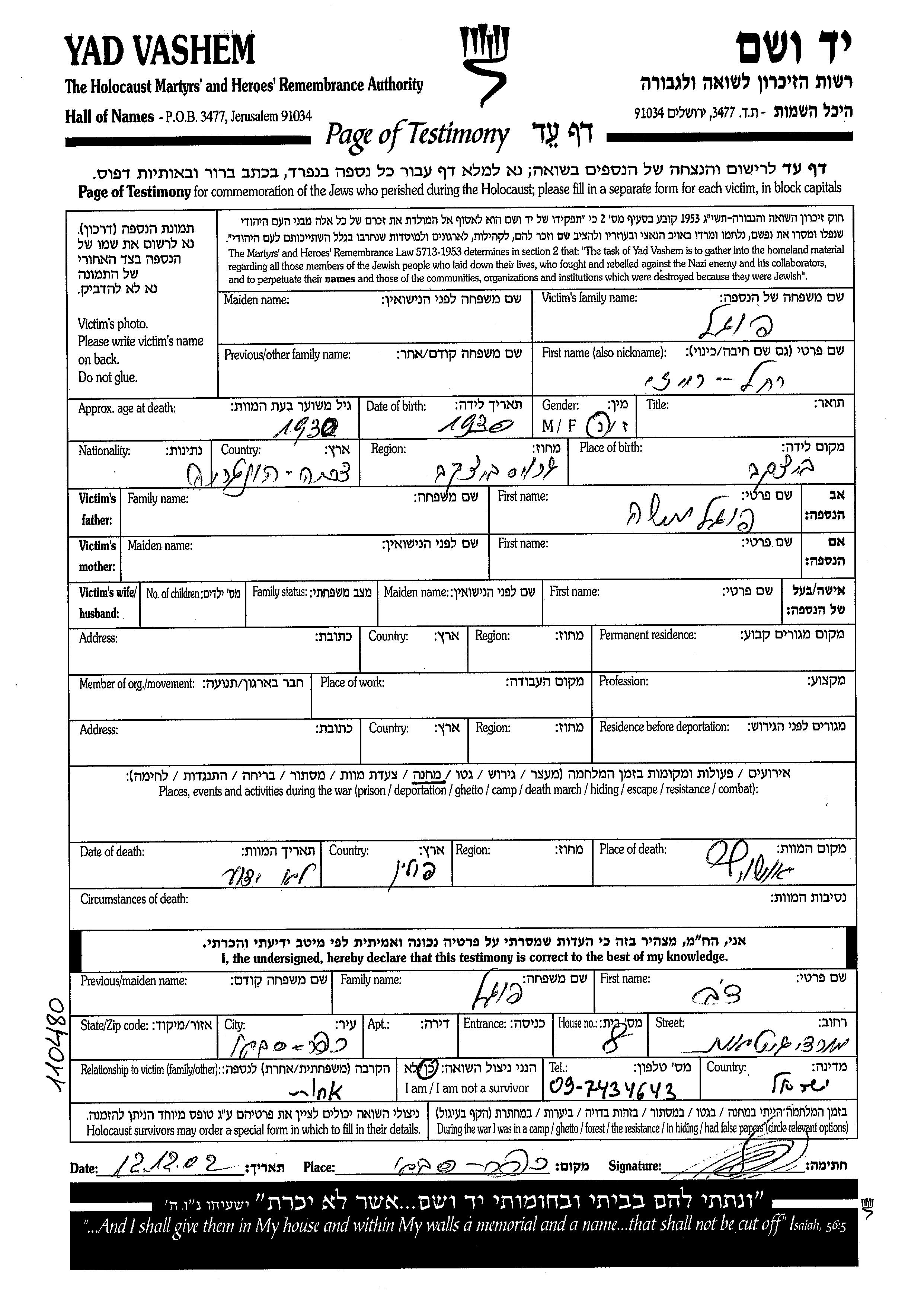 Fogel Rakhel Reizi 1930 unbekannter Ort, Gedenkblatt