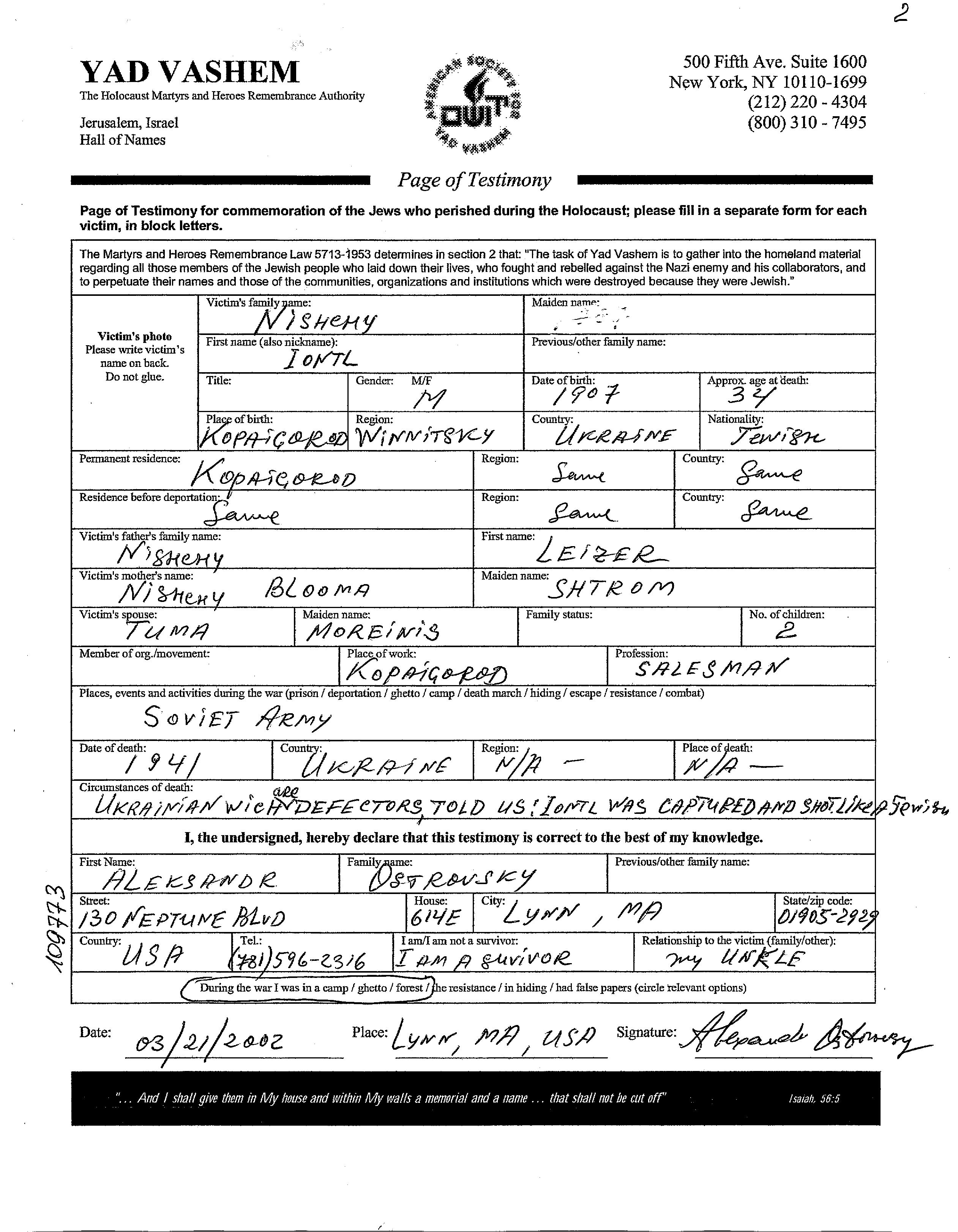 Iontl Nishchy wurde im Jahr 1907 in Kopaigorod, Ukraine (UdSSR) geboren. Er war der Sohn von Leizer und Blooma, geb. Shtrom. Er war Handelsvertreter/in und mit Tuma, geb. Moreinis Verheiratet. Vor dem Zweiten Weltkrieg lebte er in Kopaigorod, Ukraine (UdSSR). Während des Krieges war er in die Sowjetischen Streitkräfte.