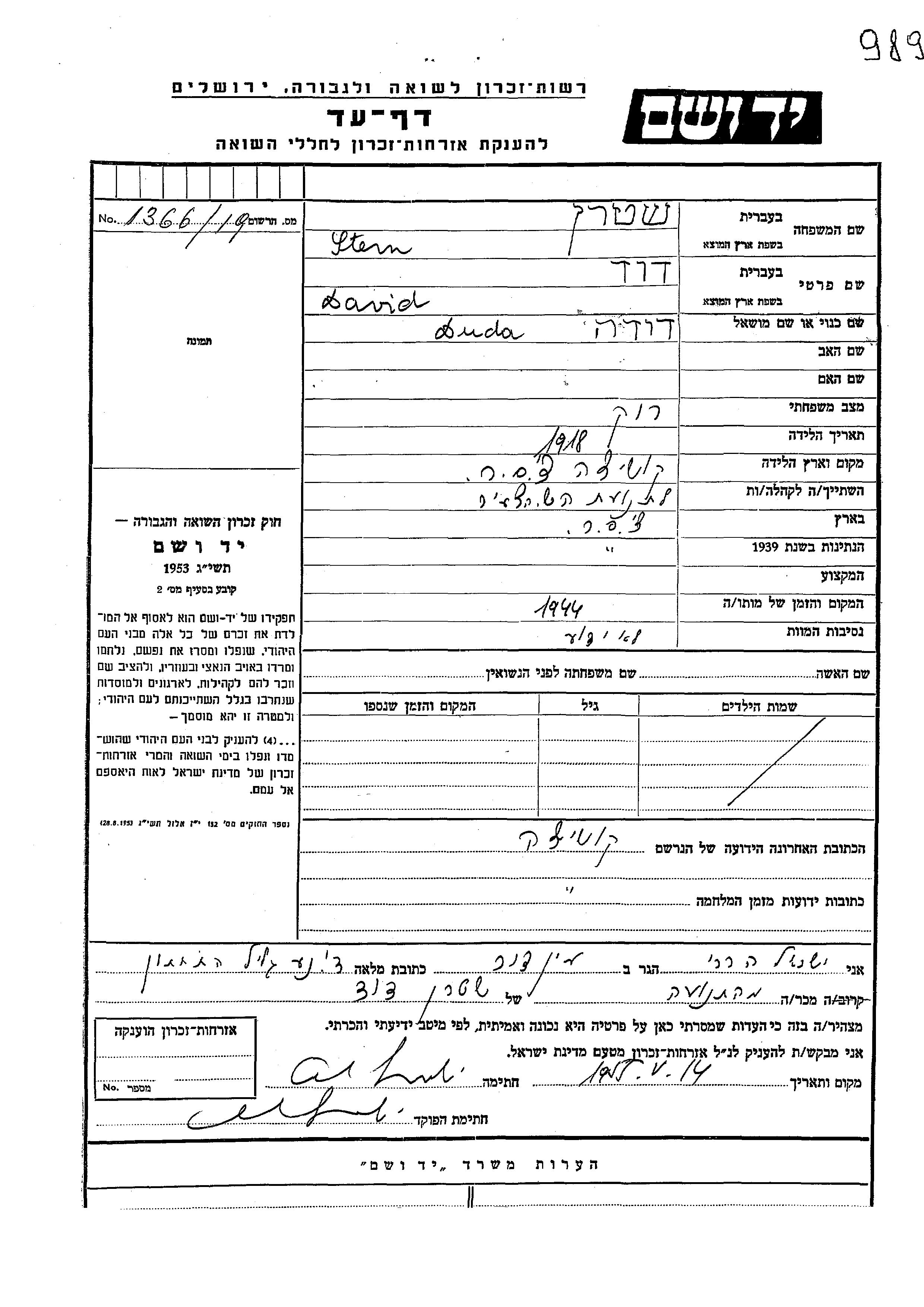 David Stern wurde im Jahr 1918 in Kosice, Tschechoslowakei geboren. Er war Ledig. Während des Krieges war er in Kosice, Tschechoslowakei.