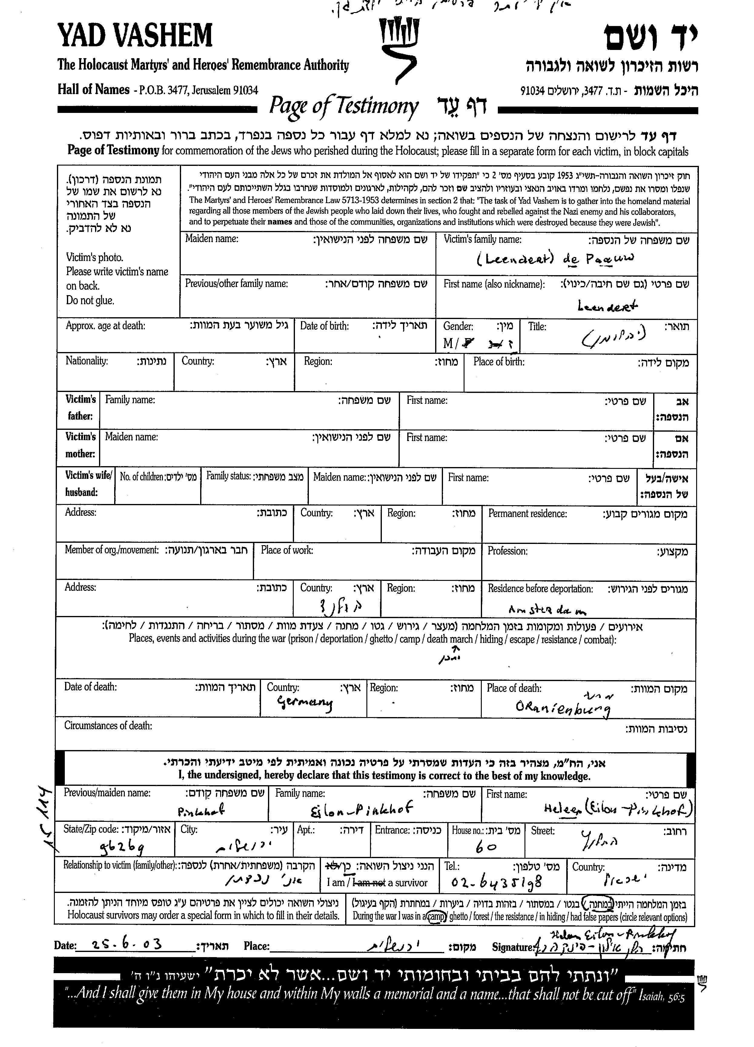Leendert wurde in der Schoah ermordet. Todesort: Oranienburg, Deutsches Reich.