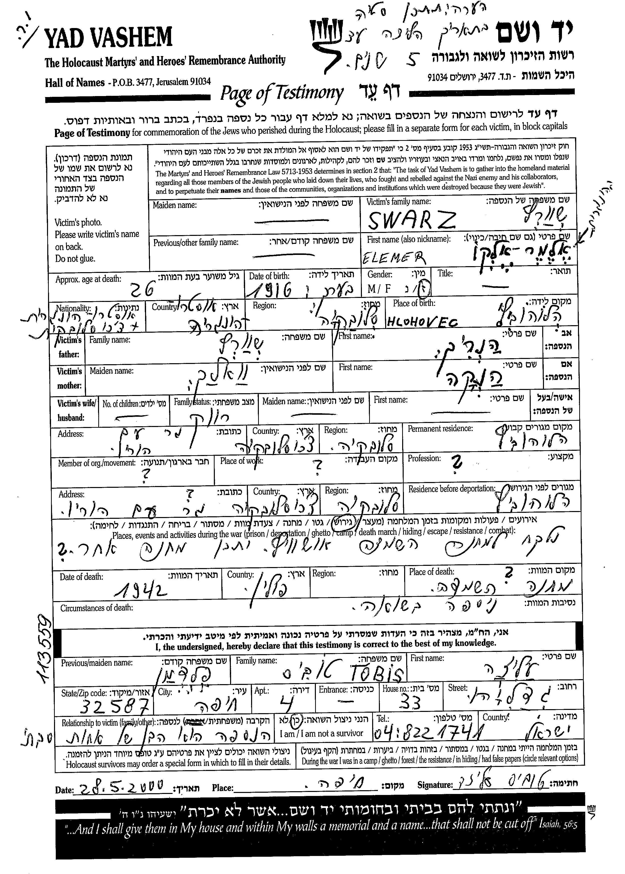 Elemer Swarz wurde im Jahr 1916 in Hlohovec, Tschechoslowakei geboren. Er war der Sohn von Henrikh und Hanka. Er war Ledig. Vor dem Zweiten Weltkrieg lebte er in Hlohovec, Tschechoslowakei. Während des Krieges war er in Auschwitz, Polen.