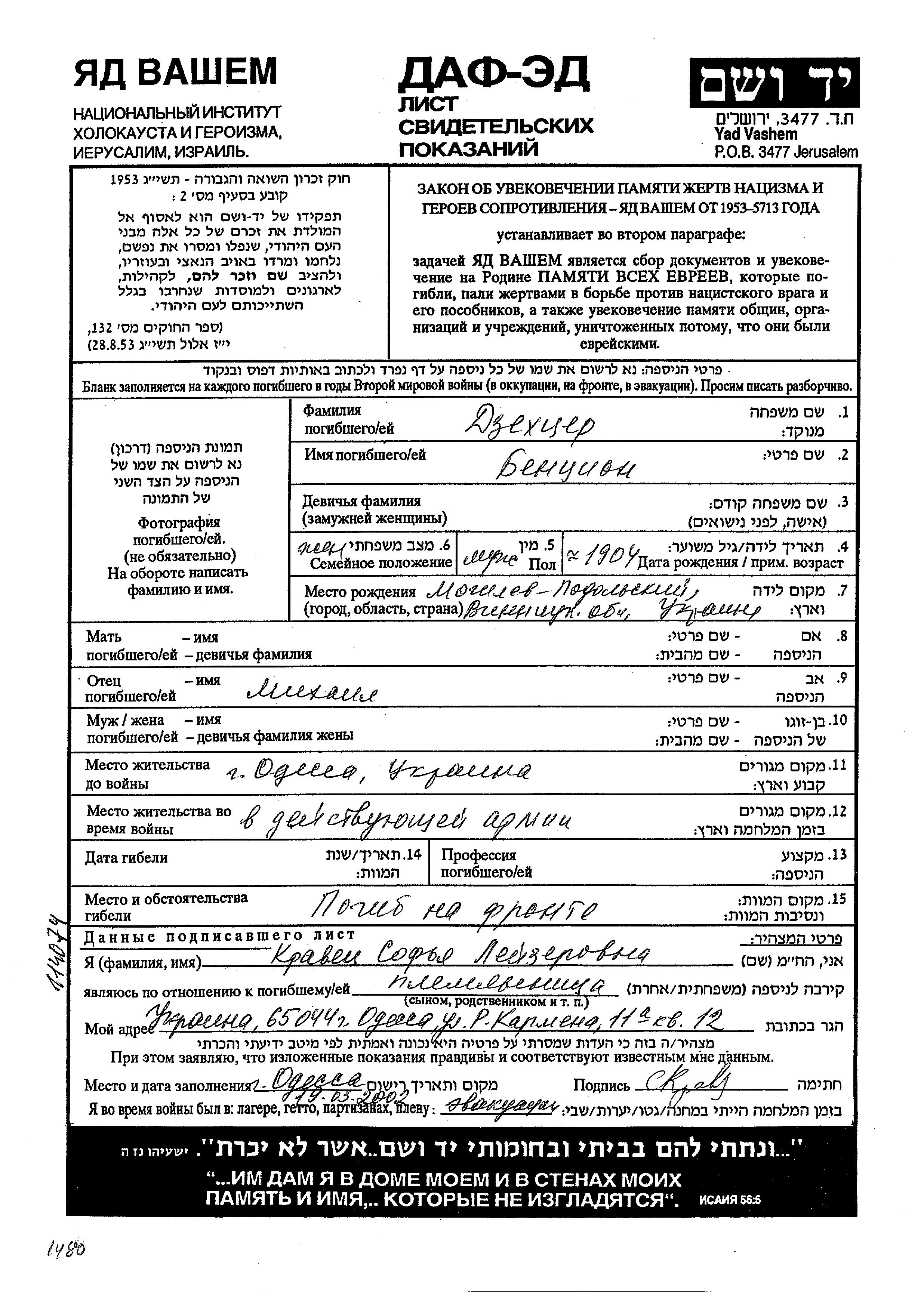 Bentzion Dzekhtzer wurde im Jahr 1904 in Mogilev Podolski, Ukraine (UdSSR) geboren. Er war der Sohn von Mikhail. Er war Verheiratet. Vor dem Zweiten Weltkrieg lebte er in Odessa, Ukraine (UdSSR). Während des Krieges war er in die Sowjetischen Streitkräfte.