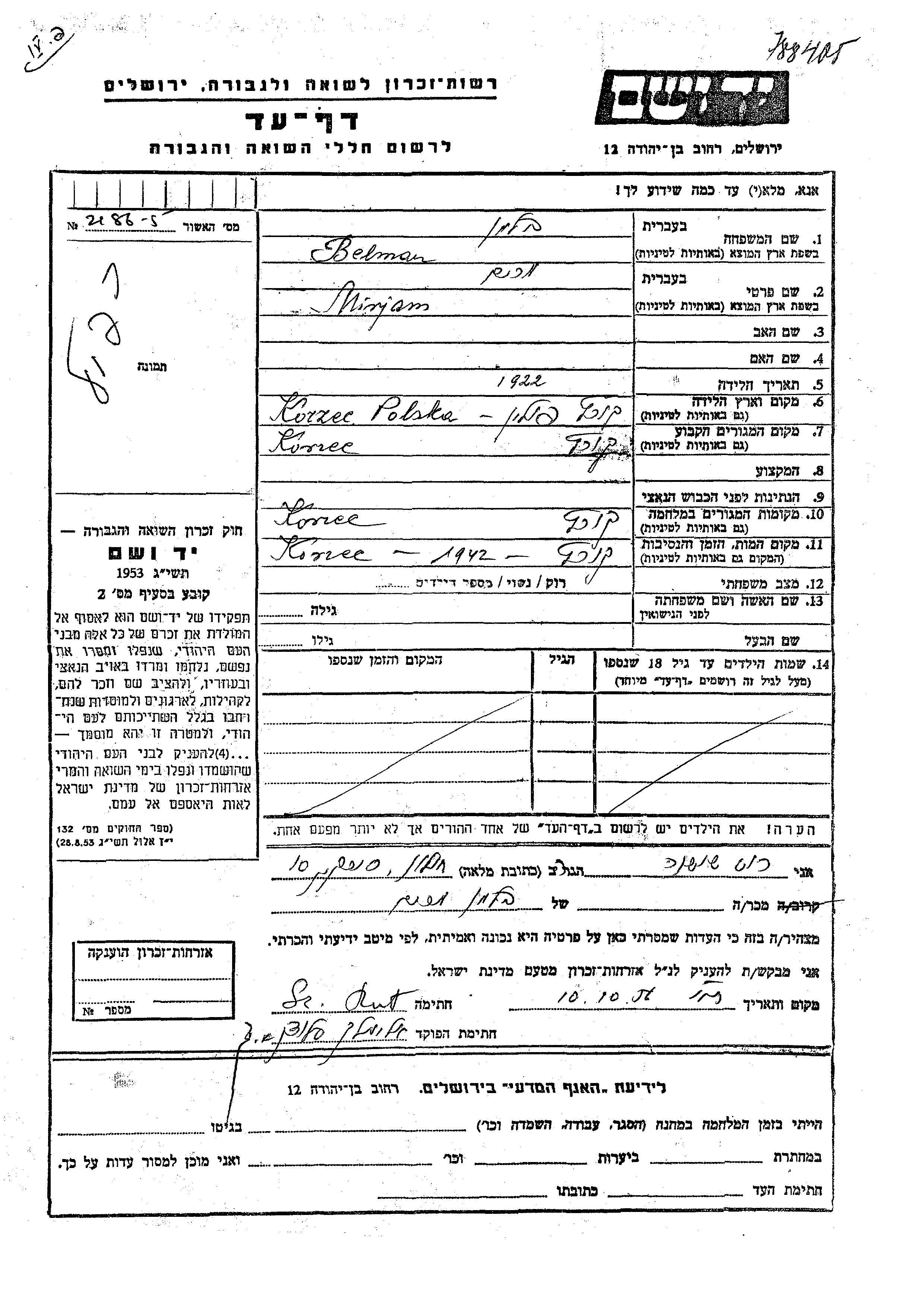 Belman Miryam 1922 Korzec, Polen Gedenkblatt