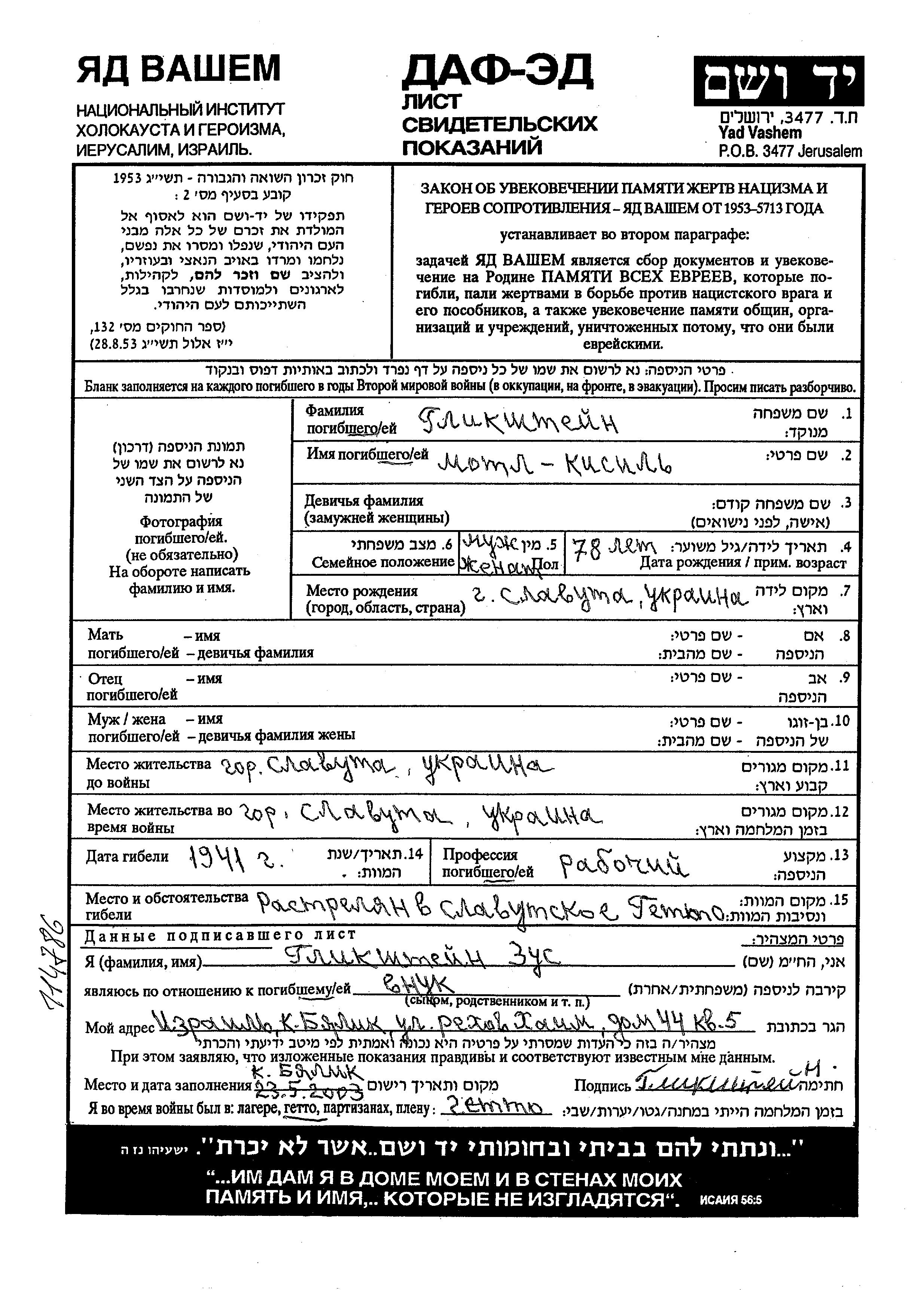 Motl Kisil Glikshtein wurde im Jahr 1863 in Slavuta, Ukraine (UdSSR) geboren. Er war Arbeiter/-in und Verheiratet. Vor dem Zweiten Weltkrieg lebte er in Slavuta, Ukraine (UdSSR). Während des Krieges war er in Slavuta, Ukraine (UdSSR).