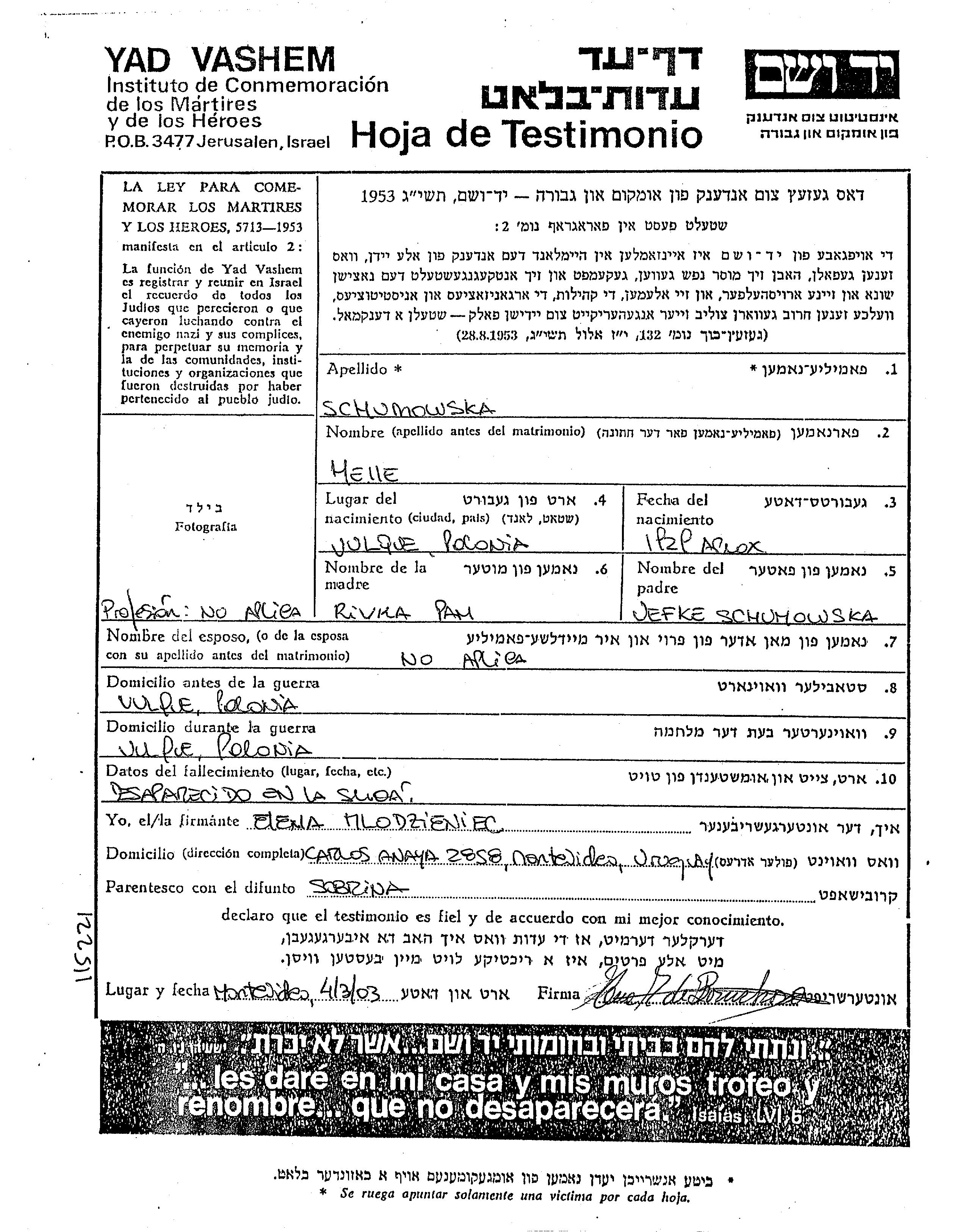 Melle Schumowska wurde im Jahr 1929 in Vulpie, Polen geboren. Er war der Sohn von Vefke und Rivka, geb. Pam. Vor dem Zweiten Weltkrieg lebte er in Vulpie, Polen. Während des Krieges war er in Vulpie, Polen.
