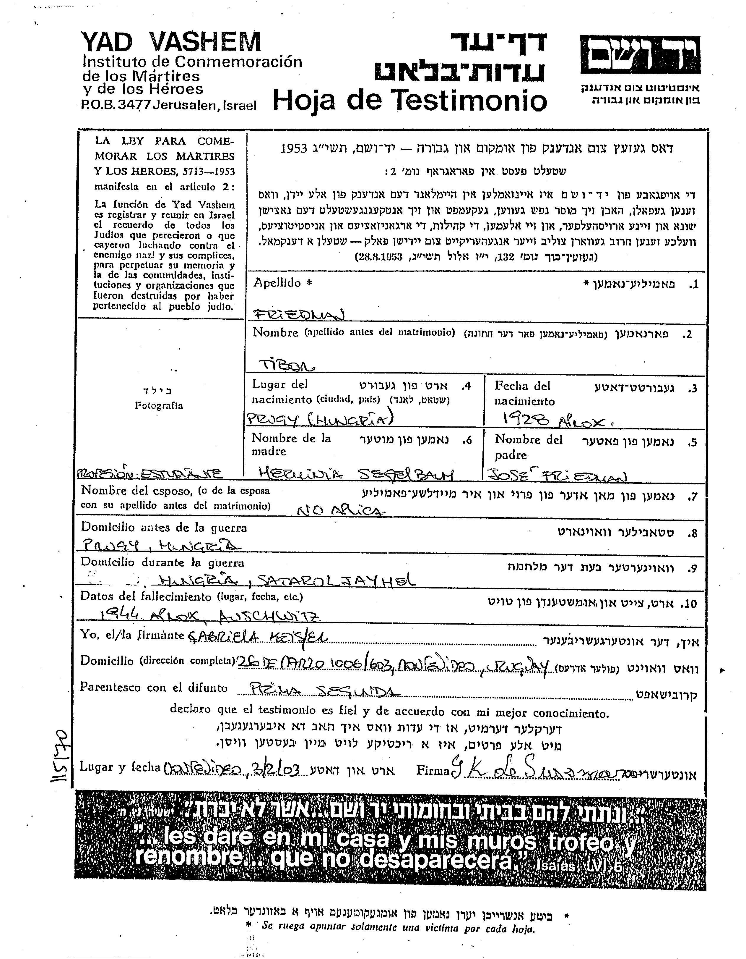 Tibor Friedman wurde im Jahr 1928 in Prugy, Ungarn geboren. Er war der Sohn von Jose und Herminia, geb. Segelbaum. Er war Student. Vor dem Zweiten Weltkrieg lebte er in Prugy, Ungarn. Während des Krieges war er in Prugy, Ungarn.
