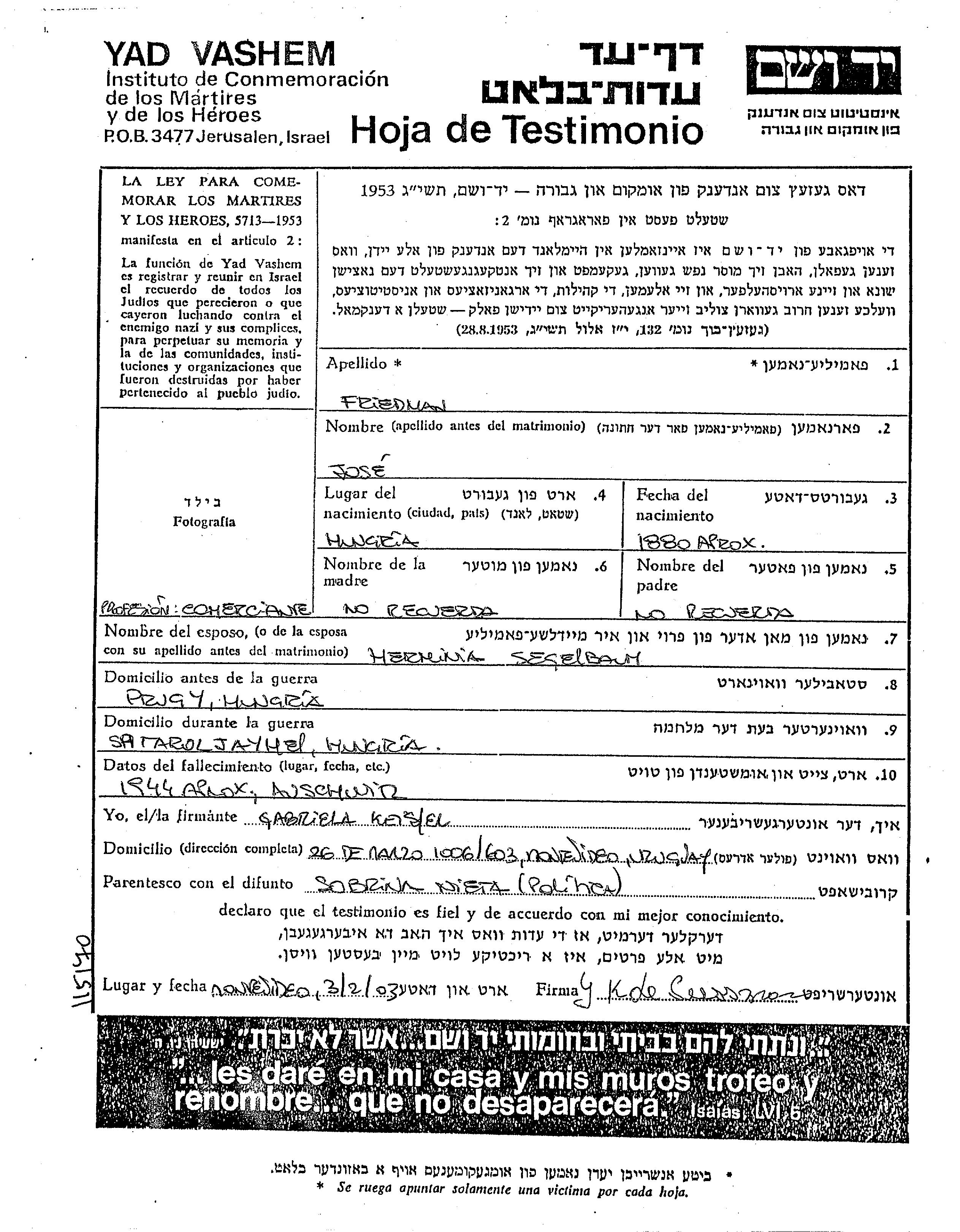 Jose Friedman wurde im Jahr 1880 in Ungarn geboren. Er war Kaufmann/-frau und mit Hermina, geb. Segelbaum Verheiratet. Vor dem Zweiten Weltkrieg lebte er in Prugy, Ungarn. Während des Krieges war er in Satoraljaujhely, Ungarn.