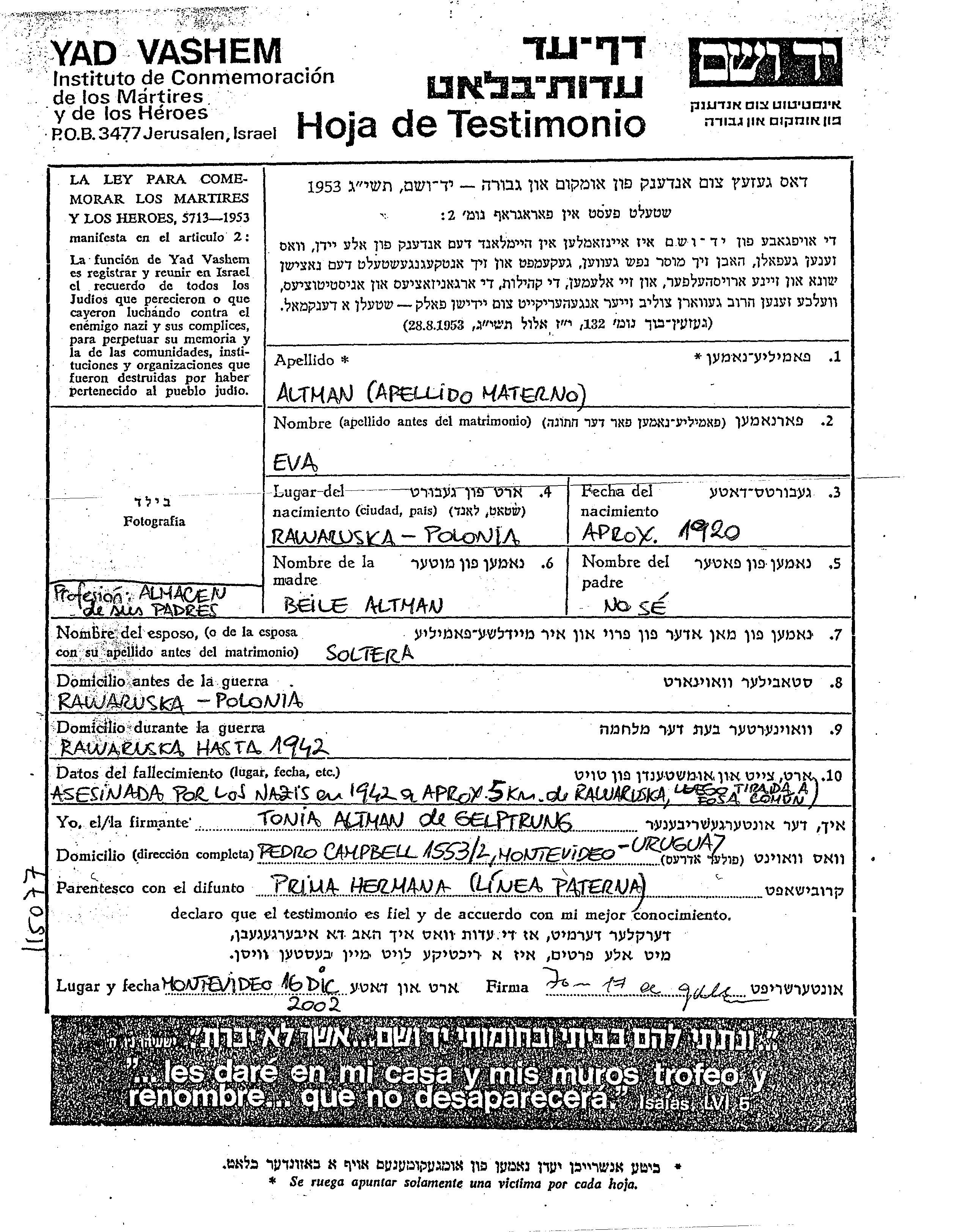 Eva Name unbekannt wurde im Jahr 1920 in Rawaruska, Polen geboren. Sie war die Tochter von Beile, geb. Altman. Sie war Almacen und Ledig. Vor dem Zweiten Weltkrieg lebte sie in Rawaruska, Polen. Während des Krieges war sie in Rawaruska, Polen.