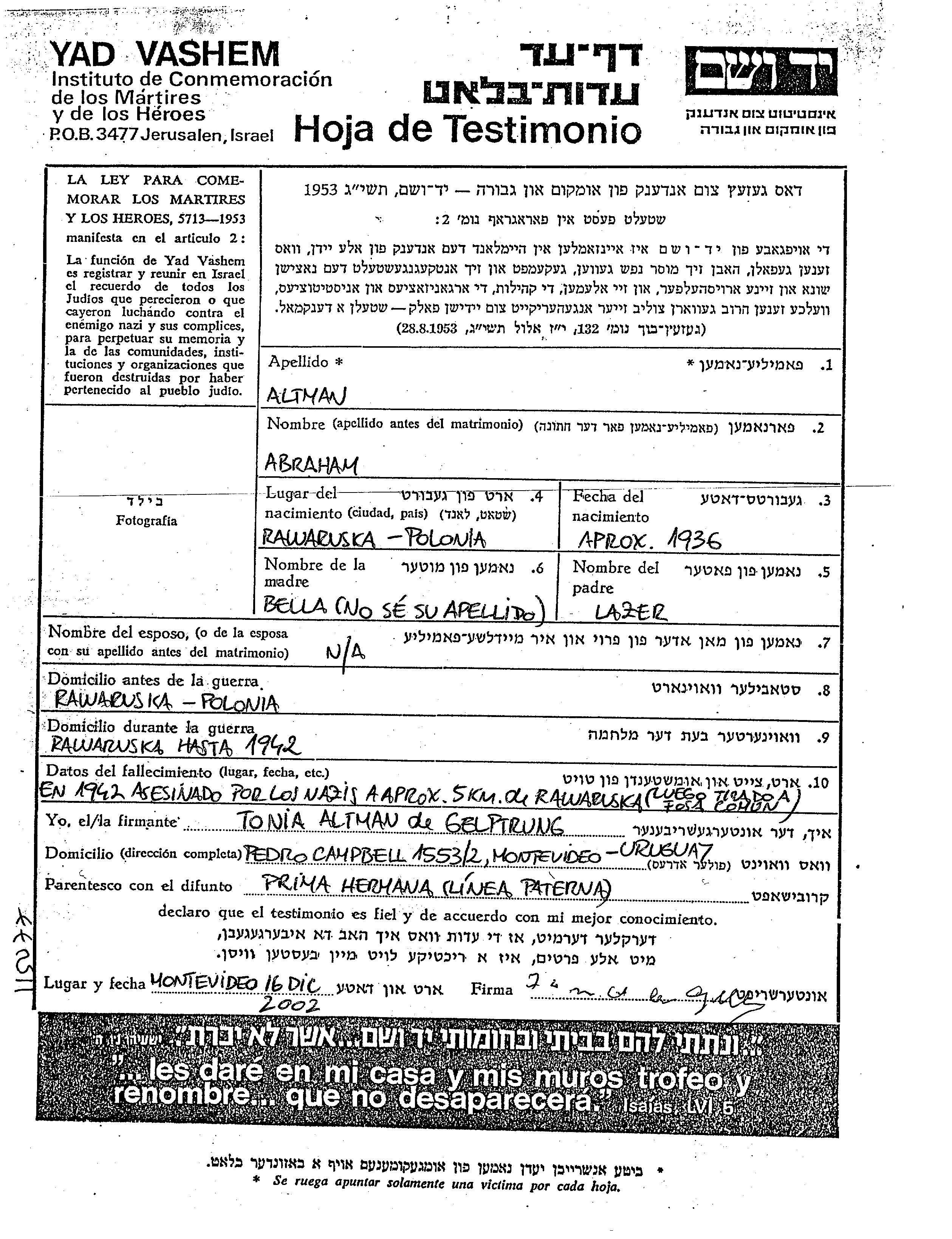 Abraham Altman wurde im Jahr 1936 in Rawa Ruska, Polen geboren. Er war der Sohn von Lazer und Bella. Vor dem Zweiten Weltkrieg lebte er in Rawa Ruska, Polen. Während des Krieges war er in Rawa Ruska, Polen.
