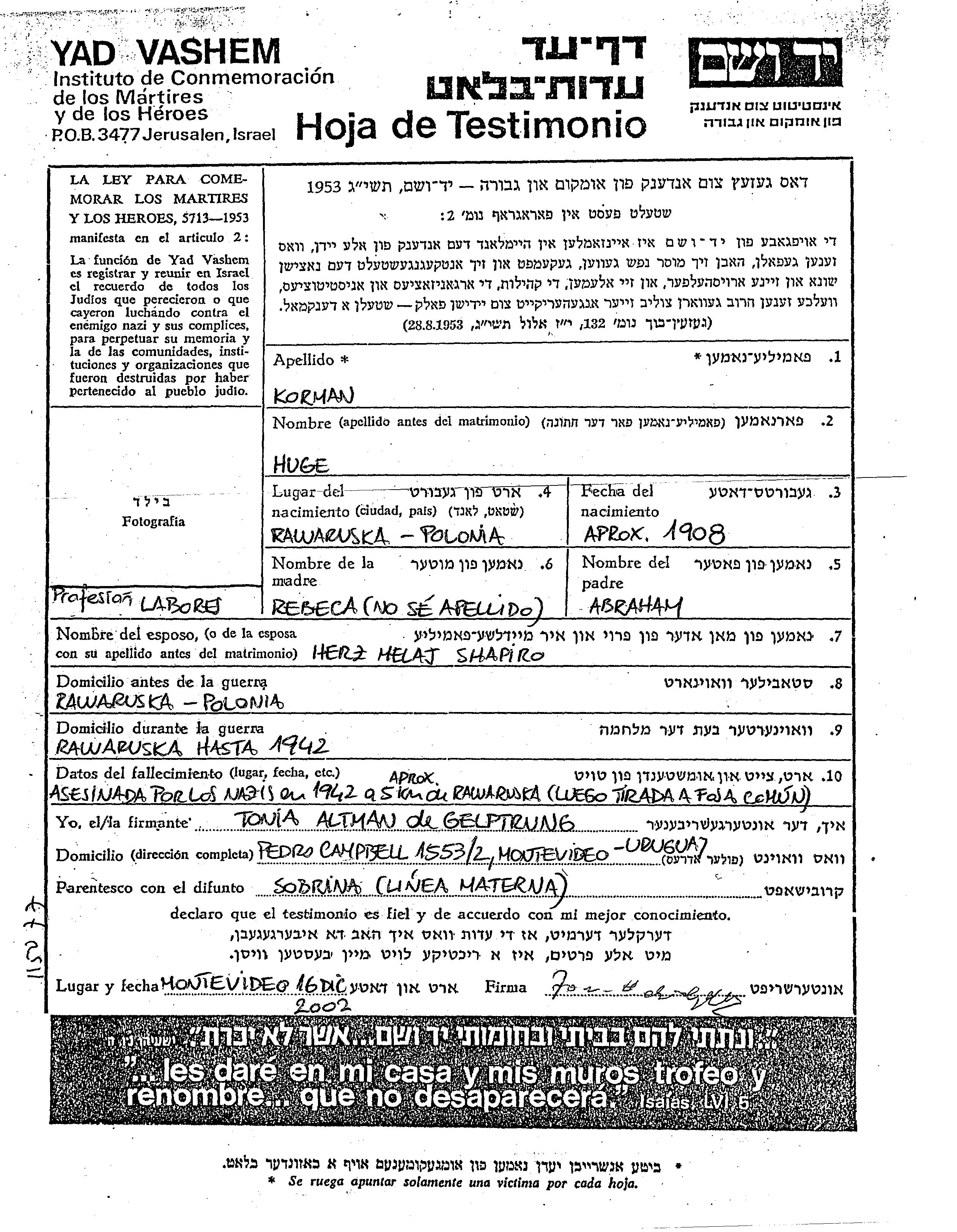 Huge Korman wurde im Jahr 1908 in Ravaruska, Polen geboren. Sie war die Tochter von Abraham und Rebeca. Sie war Hausfrau. Vor dem Zweiten Weltkrieg lebte sie in Ravaruska, Polen. Während des Krieges war sie in Ravaruska, Polen.
