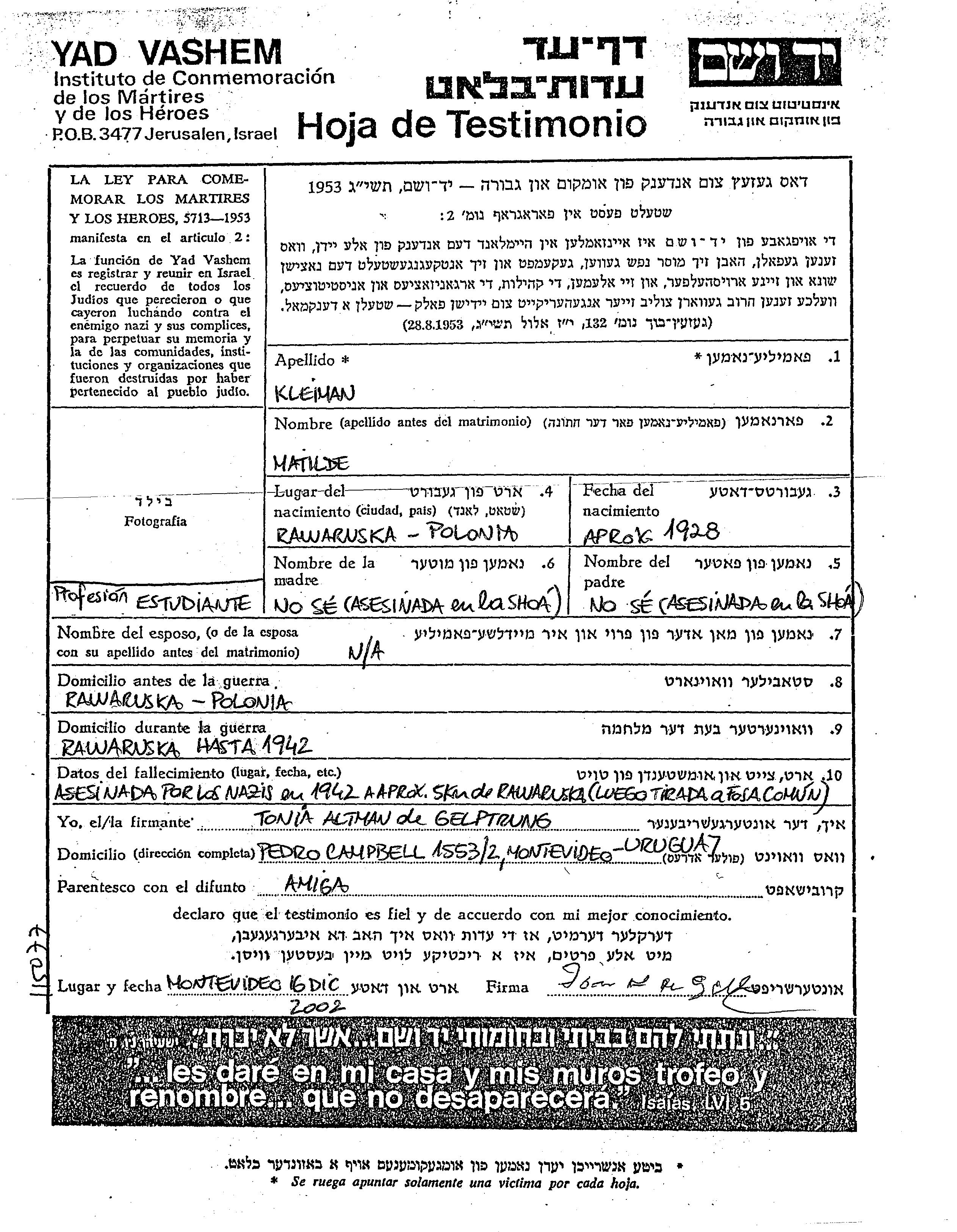 Matilde Kleiman wurde im Jahr 1928 in Rawa Ruska, Polen geboren. Sie war Student. Vor dem Zweiten Weltkrieg lebte sie in Rawa Ruska, Polen. Während des Krieges war sie in Rawa Ruska, Polen.