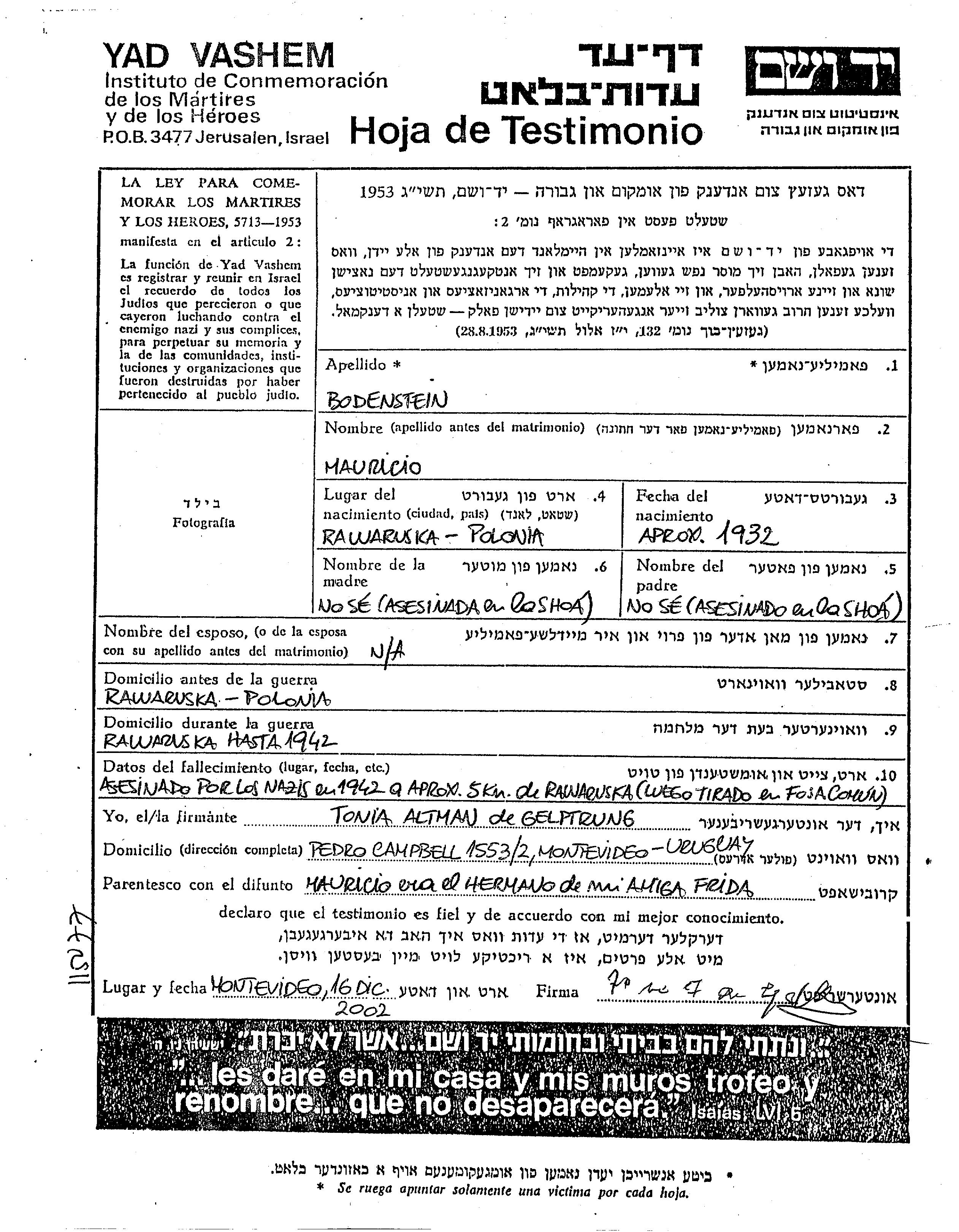 Mauricio Bodenstein wurde im Jahr 1932 in Ravaruska, Polen geboren. Vor dem Zweiten Weltkrieg lebte er in Ravaruska, Polen. Während des Krieges war er in Ravaruska, Polen.