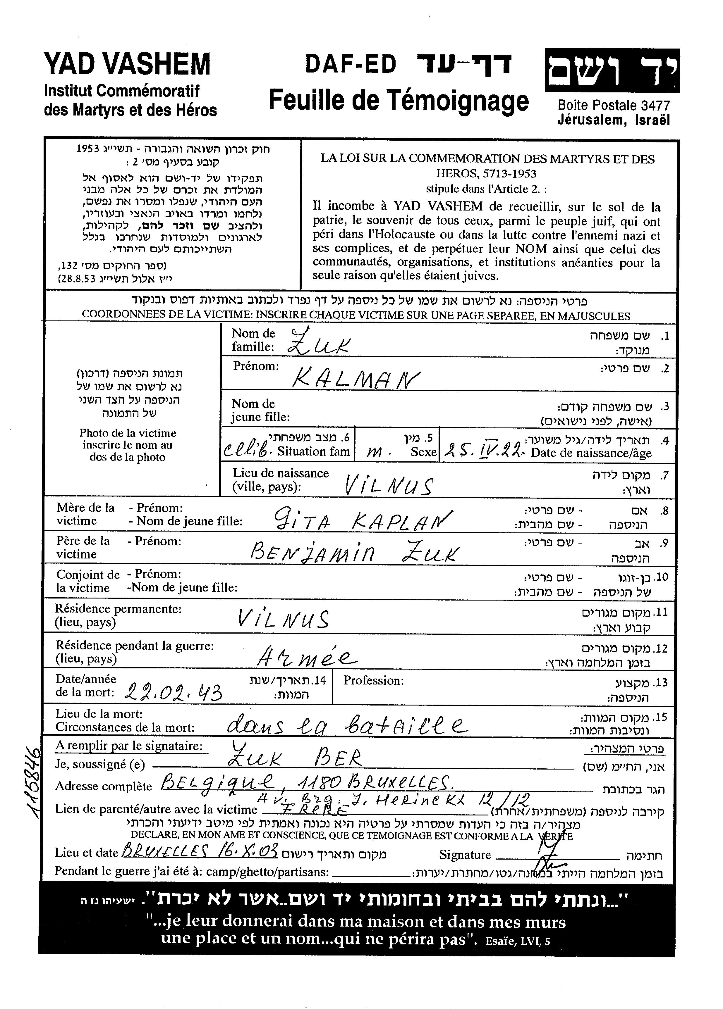 Kalman Zuk wurde im Jahr 1922 in Wilno, Polen geboren. Er war der Sohn von Benjamin und Gita, geb. Kaplan. Vor dem Zweiten Weltkrieg lebte er in Wilno, Polen.