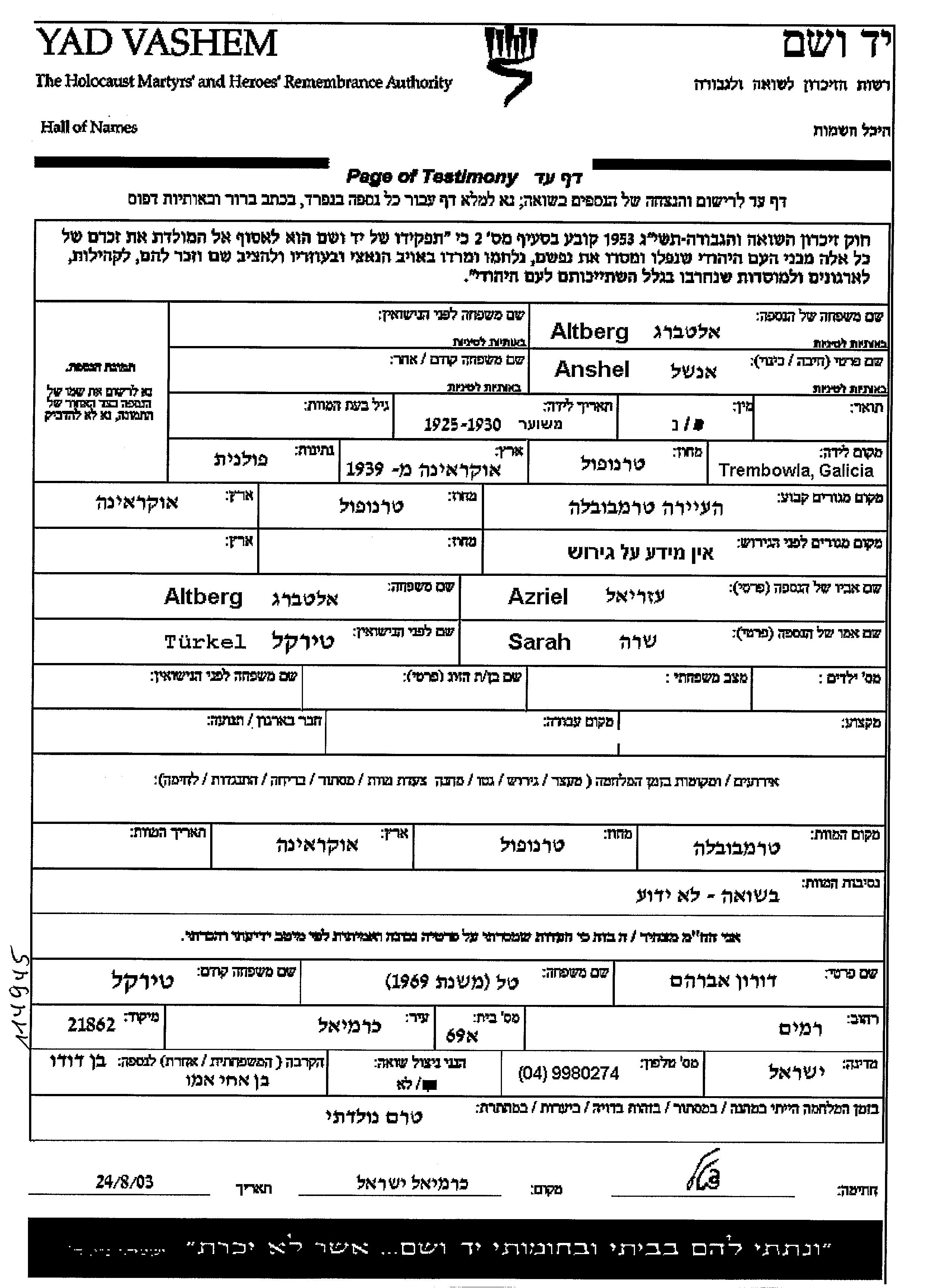 Anshel Altberg wurde im Jahr 1925 in Trembowla, Polen geboren. Er war der Sohn von Azriel und Sara, geb. Tirkel. Vor dem Zweiten Weltkrieg lebte er in Trembovla, Polen. Während des Krieges war er in Trembovla, Polen.