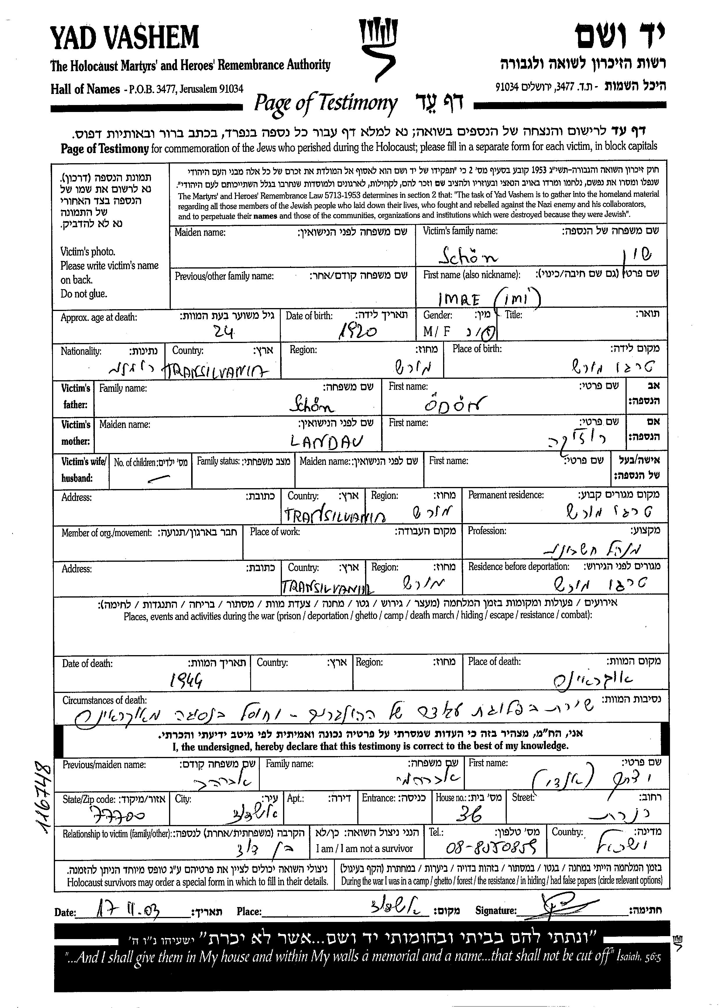 Imre Shon wurde im Jahr 1920 in Targomoris, Rumänien geboren. Er war der Sohn von Odon und Roza, geb. Landau. Er war Buchhalter/-in. Vor dem Zweiten Weltkrieg lebte er in Targomoris, Rumänien. Während des Krieges war er in Targomoris, Rumänien.