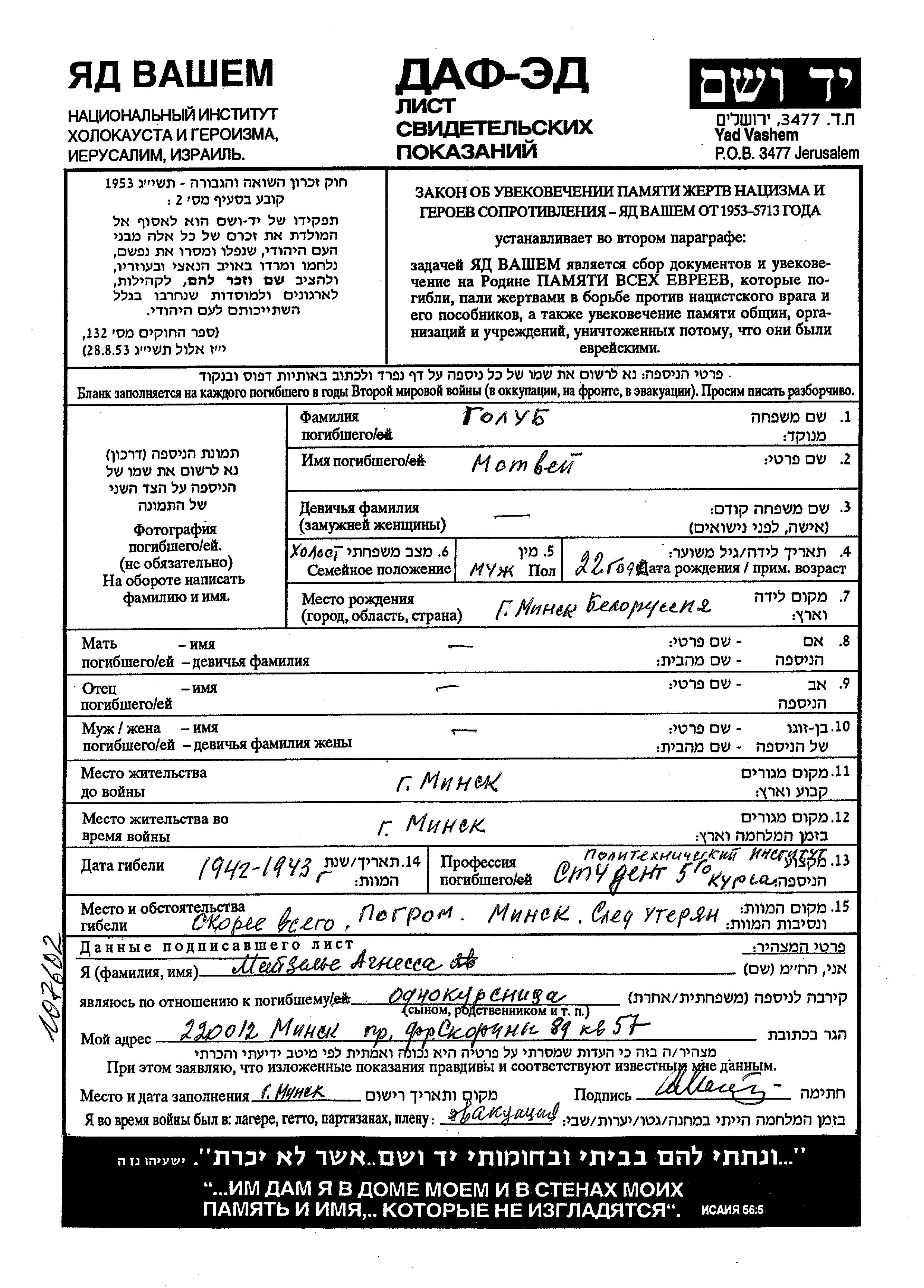 Matvei wurde in der Schoah ermordet. Todesort: Minsk, Weißrussland (UdSSR) im Jahr 1942.
