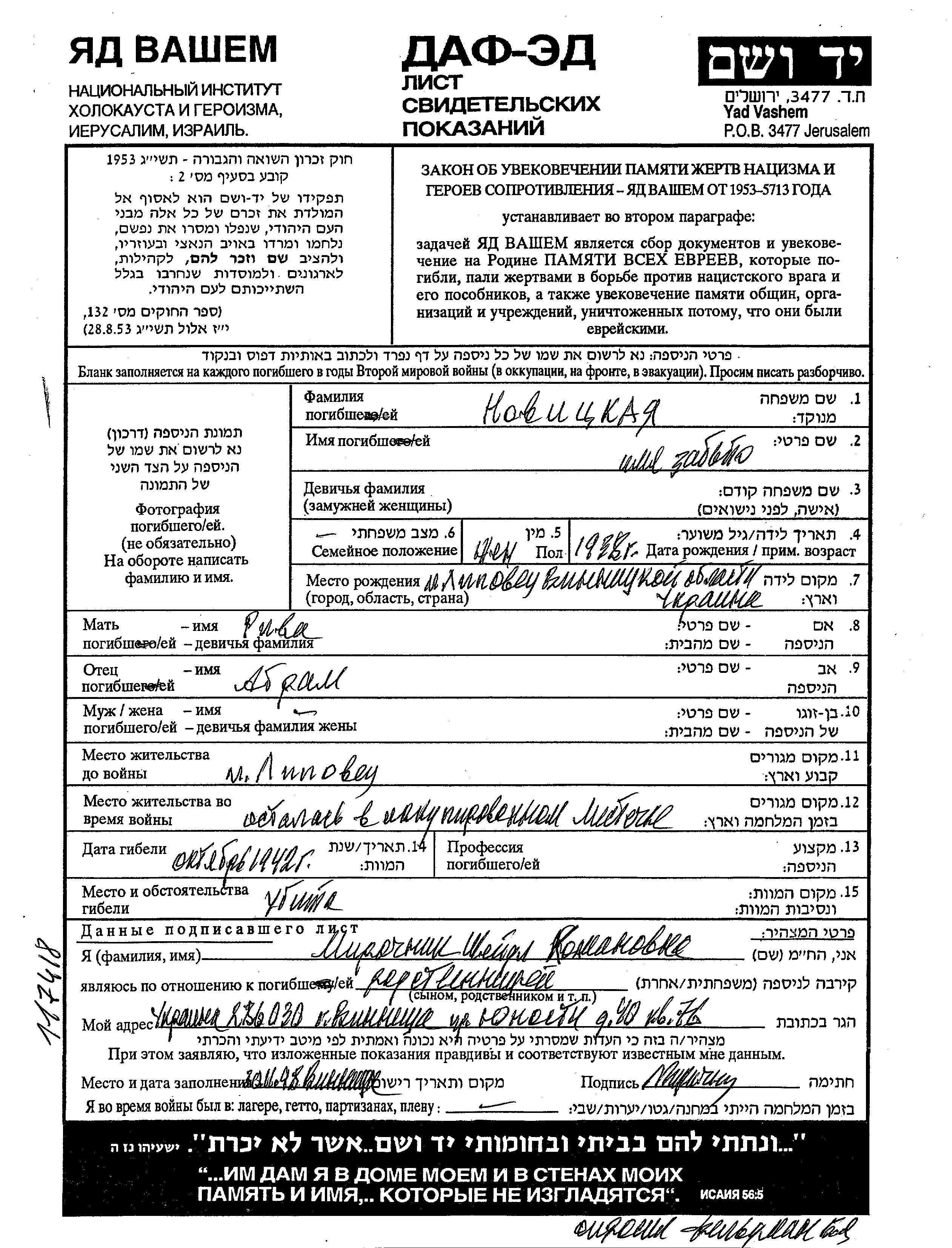 Vorname unbekannt Novitzkaya wurde im Jahr 1938 in Lipovetz, Ukraine (UdSSR) geboren. Sie war die Tochter von Abram und Riva. Sie war Kind. Vor dem Zweiten Weltkrieg lebte sie in Lipovetz, Ukraine (UdSSR). Während des Krieges war sie in Lipovetz, Ukraine (UdSSR).