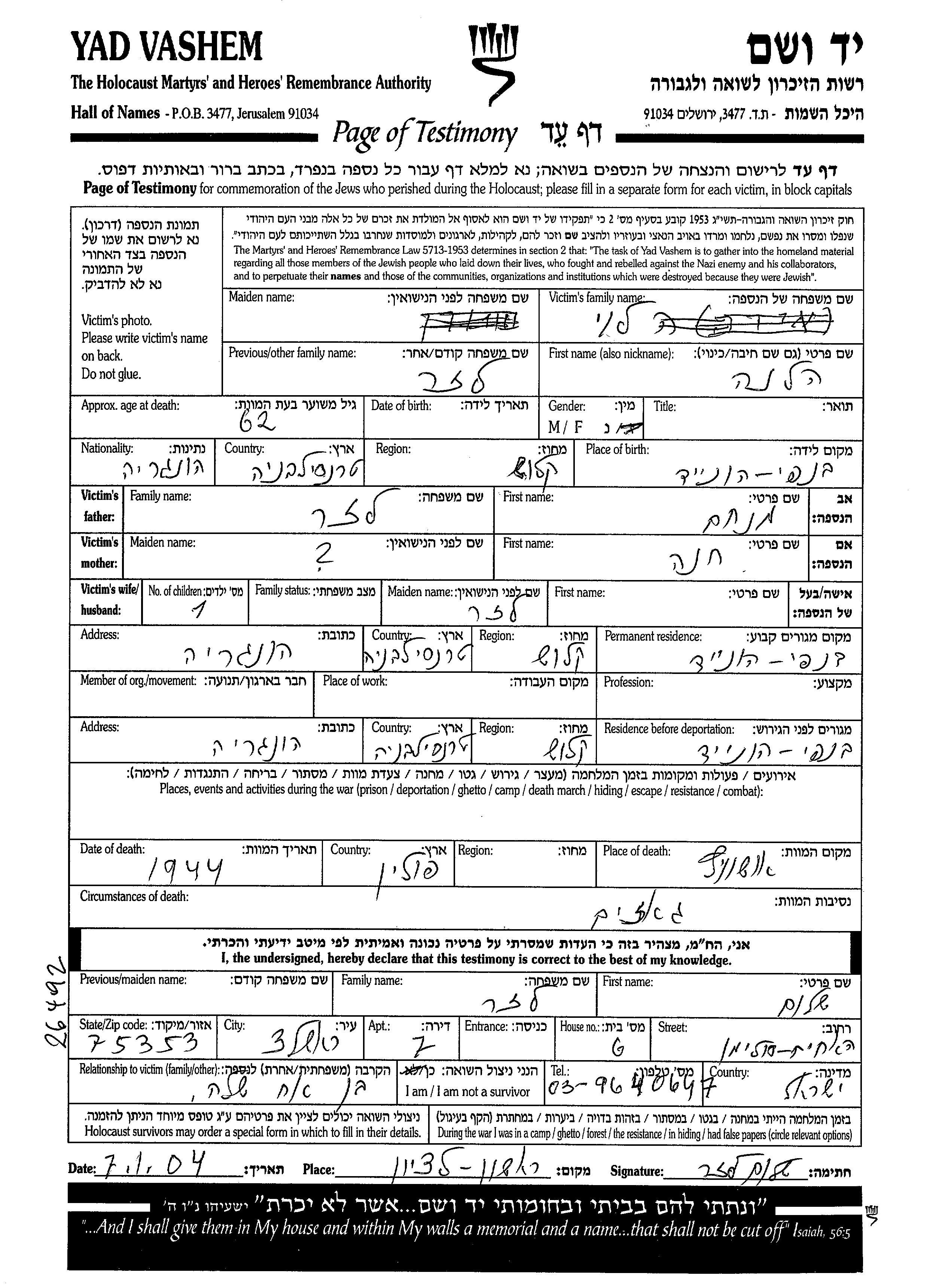 Helena Levi, geb. Lazar wurde im Jahr 1882 in Banfi Huniad, Rumänien geboren. Sie war die Tochter von Menakhem und Khana. Vor dem Zweiten Weltkrieg lebte sie in Banfi Huniad, Rumänien. Während des Krieges war sie in Banfi Huniad, Rumänien.
