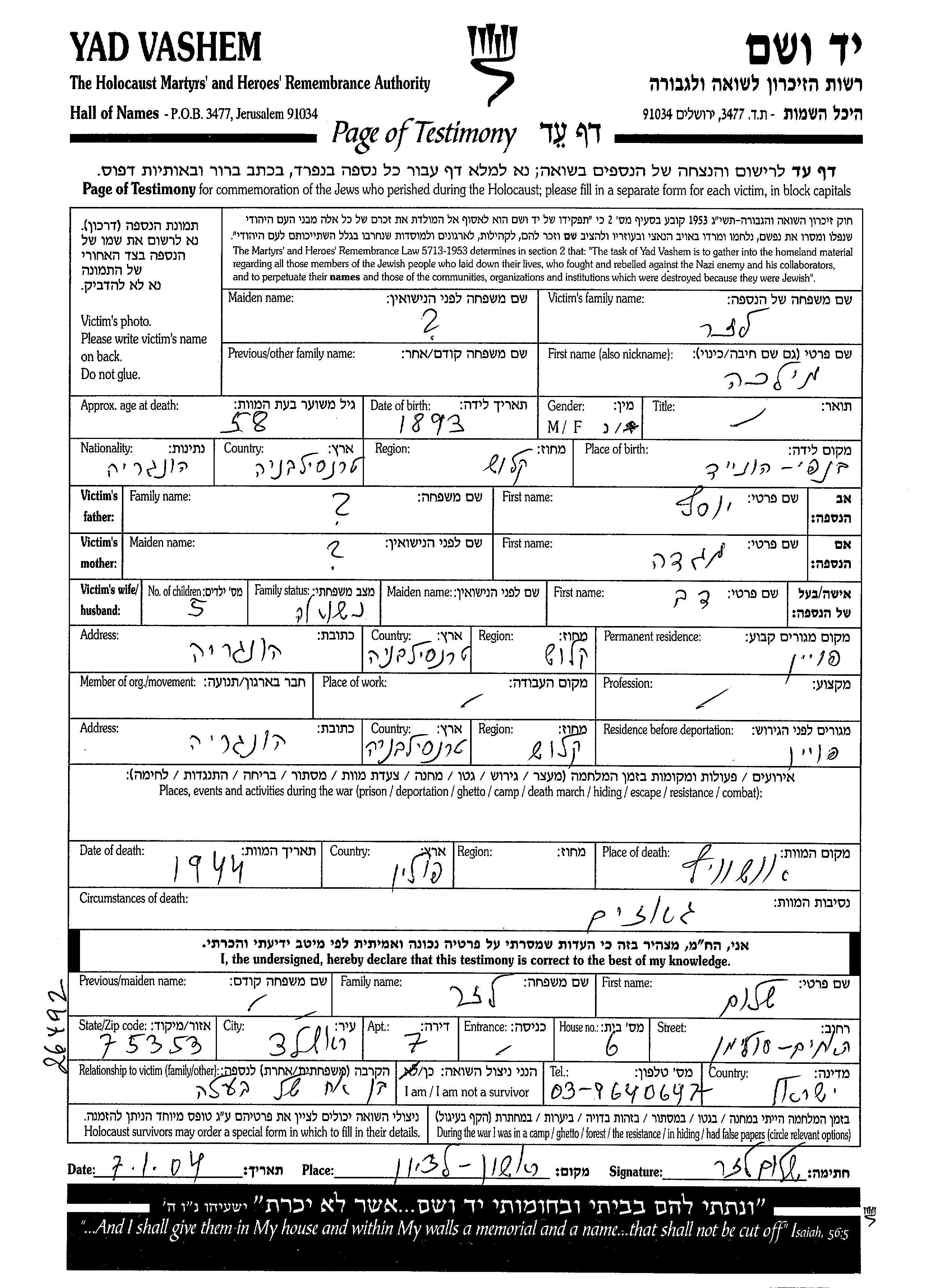Milka Lazar wurde im Jahr 1893 in Banffyhunyad, Rumänien geboren. Sie war die Tochter von Yosef und Magda. Sie war mit Dov Verheiratet. Vor dem Zweiten Weltkrieg lebte sie in Poeni, Rumänien. Während des Krieges war sie in Poeni, Rumänien.