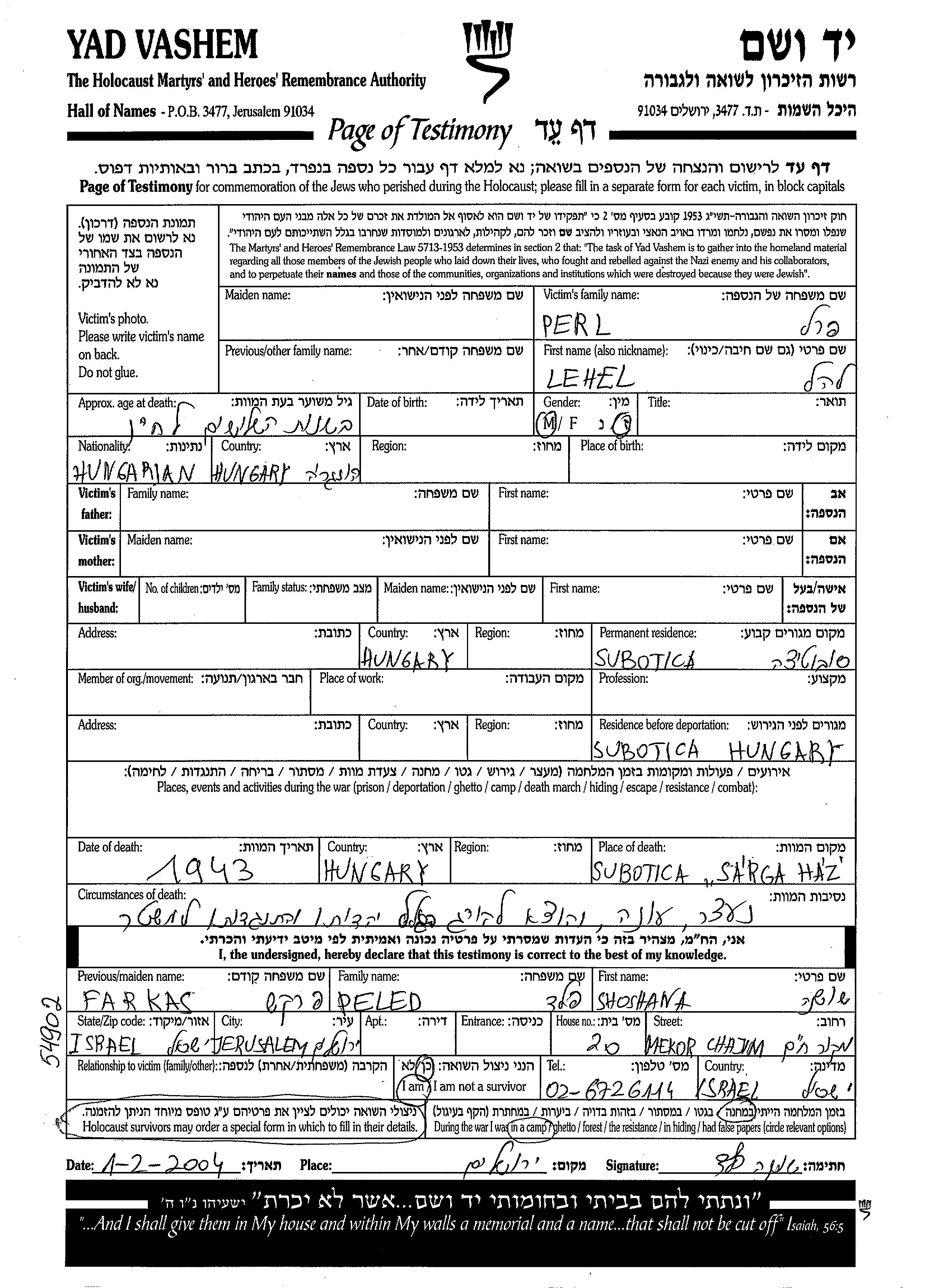Lehel Perl wurde im Jahr 1913 in Ungarn geboren. Vor dem Zweiten Weltkrieg lebte er in Subotica, Jugoslawien. Während des Krieges war er in Subotica, Jugoslawien.
