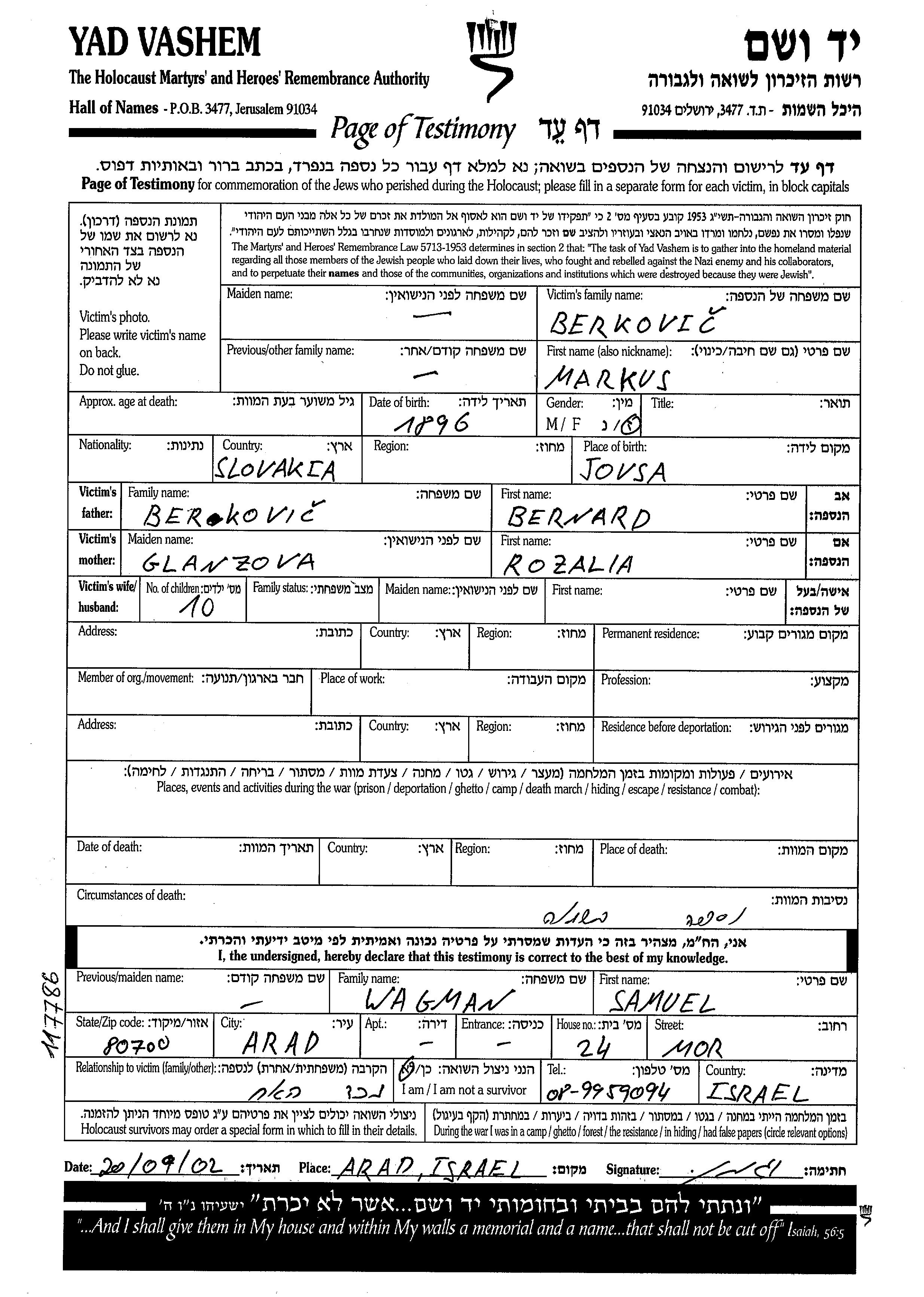 Markus Berkovic wurde im Jahr 1896 in Jovsa, Tschechoslowakei geboren. Er war der Sohn von Bernard und Rozalia, geb. Glanzova. Er war Verheiratet.