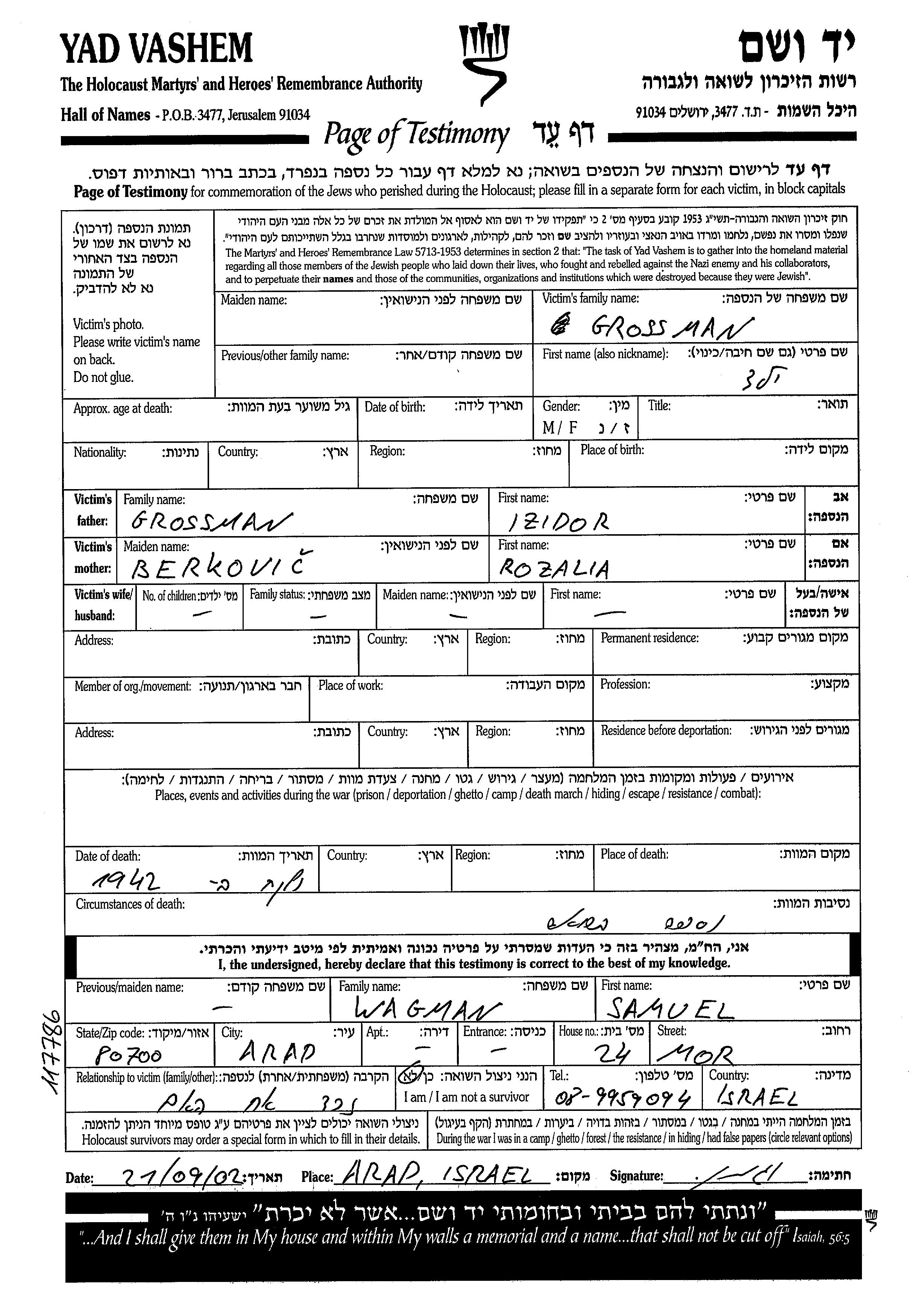 Vorname unbekannt Grossman wurde Er war der Sohn von Izidor und Rozalia, geb. Berkovic.
