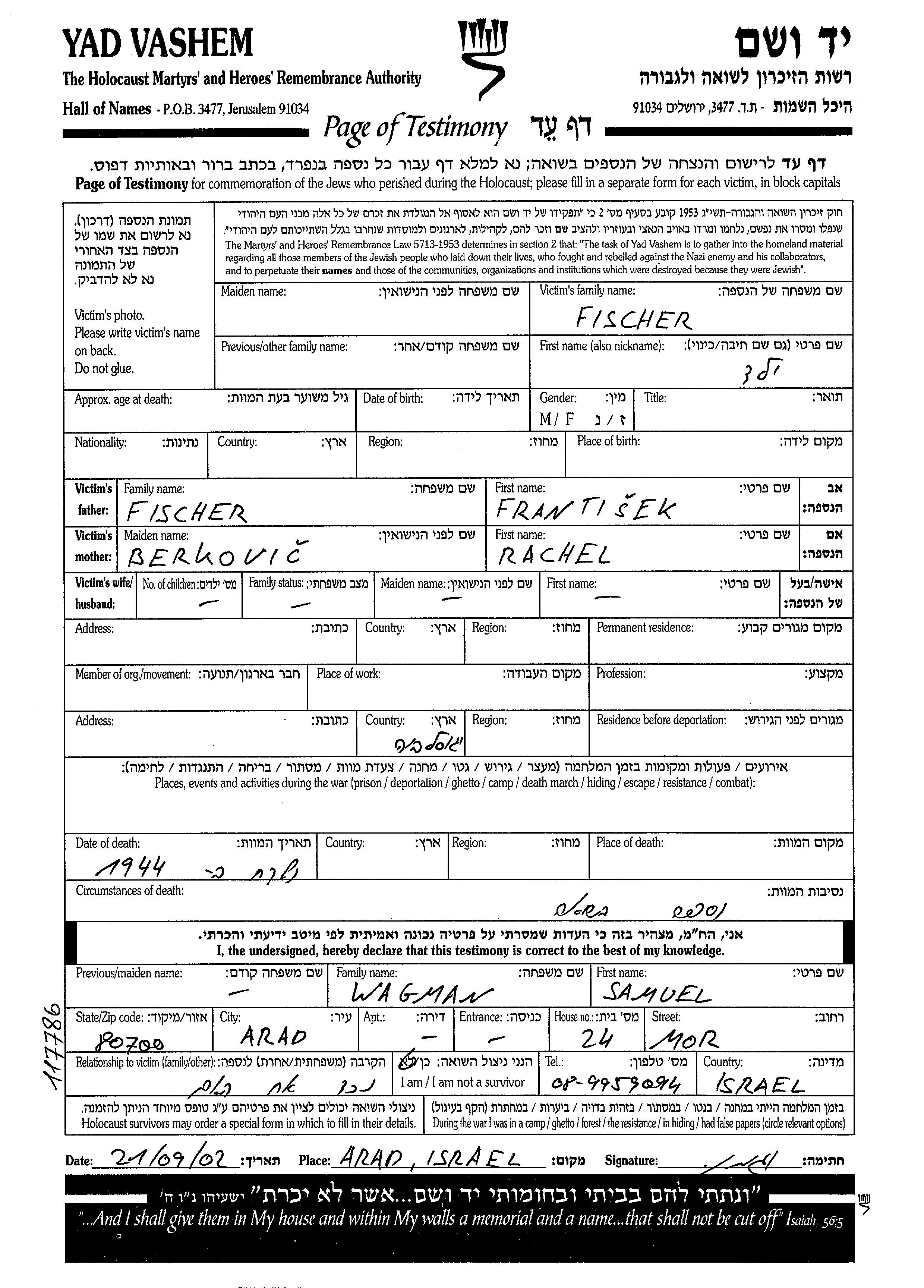 Vorname unbekannt Fischer wurde Er war der Sohn von Frantisek und Rachel, geb. Berkovic. Er war Kind. Während des Krieges war er in Jugoslawien.