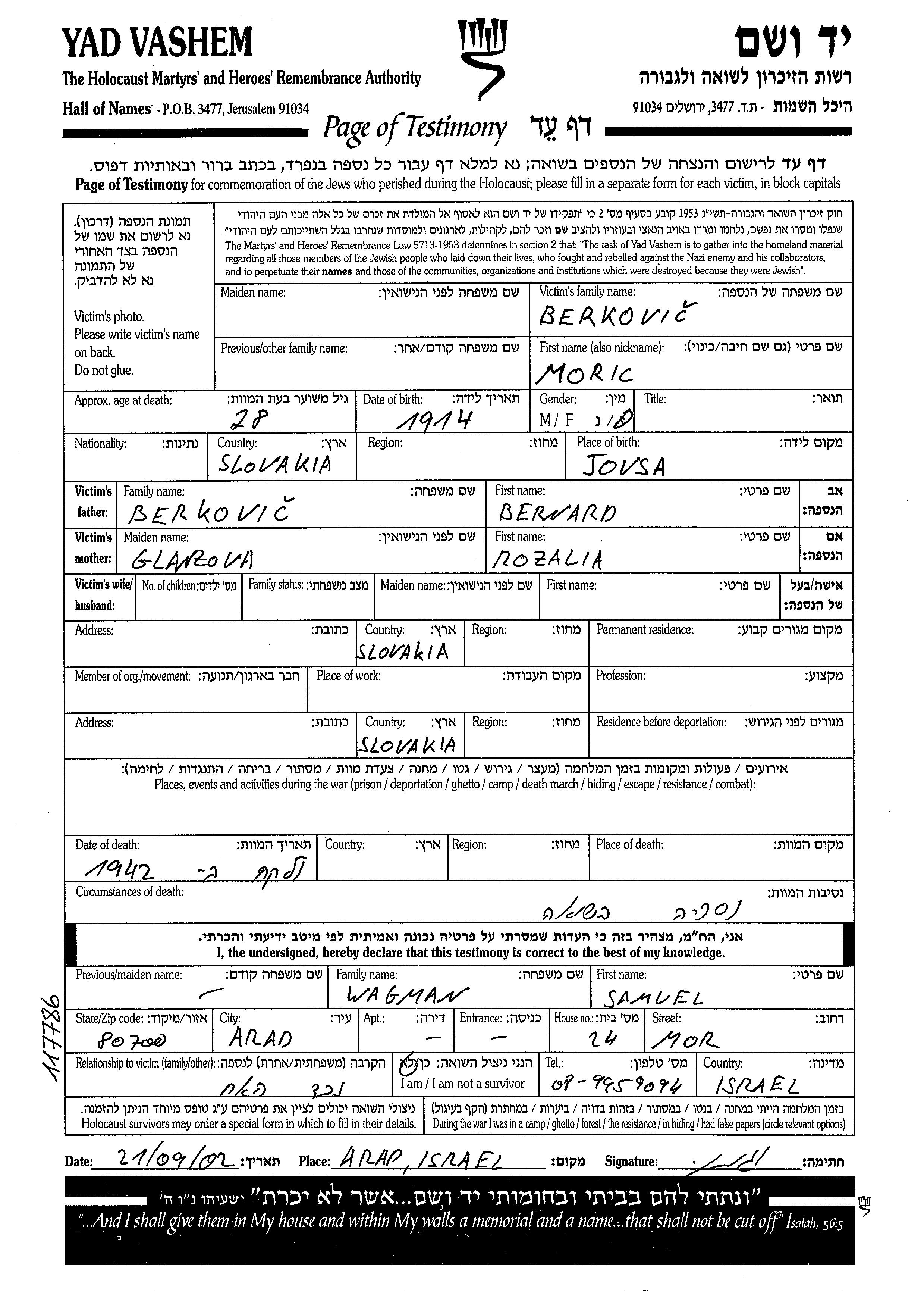 Moric Berkovic wurde im Jahr 1914 in Jovsa, Tschechoslowakei geboren. Er war der Sohn von Bernard und Rozalia, geb. Glanzova. Vor dem Zweiten Weltkrieg lebte er in Slovakia, Tschechoslowakei. Während des Krieges war er in Slowakei.