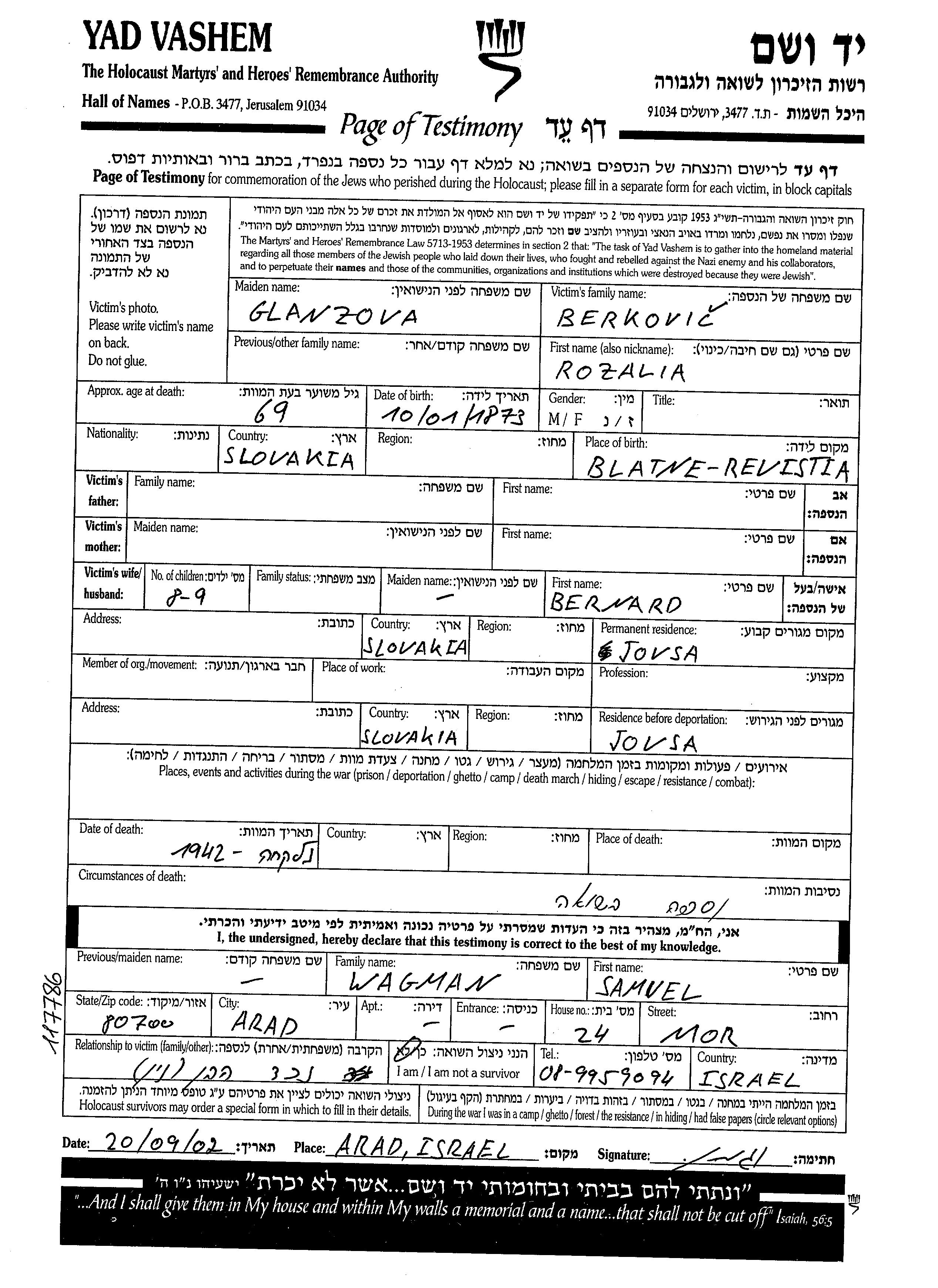 Rozalia Berkovic, geb. Glanzova wurde im Jahr 1873 in Blatne Reviste, Tschechoslowakei geboren. Sie war mit Bernard Verheiratet. Vor dem Zweiten Weltkrieg lebte sie in Jovsa, Tschechoslowakei. Während des Krieges war sie in Jovsa, Tschechoslowakei.