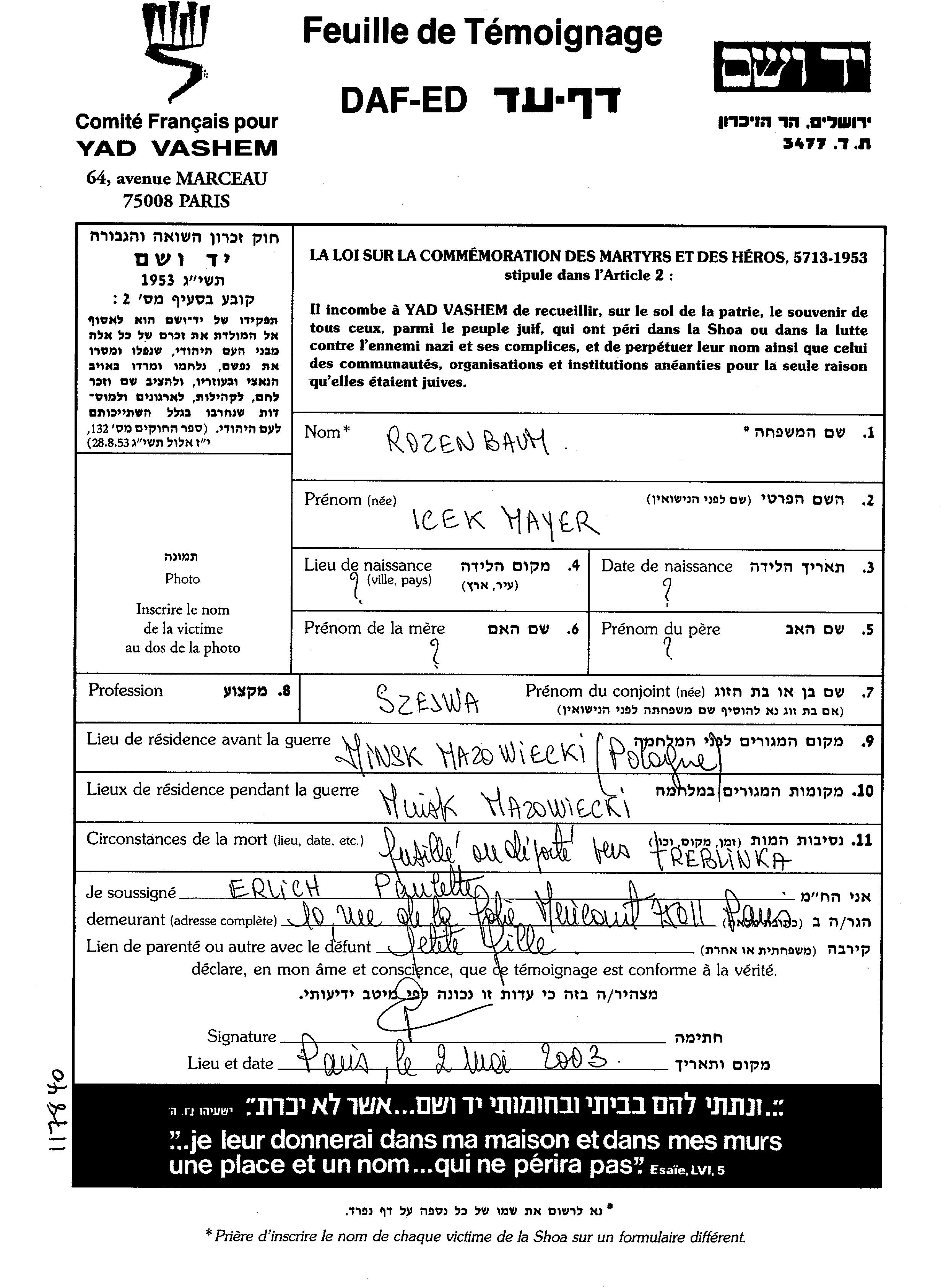 Mayer Icek Rozenbaum. Vor dem Zweiten Weltkrieg lebte er in Minsk Mazowiecki, Polen. Während des Krieges war er in Minsk Mazowiecki, Polen.