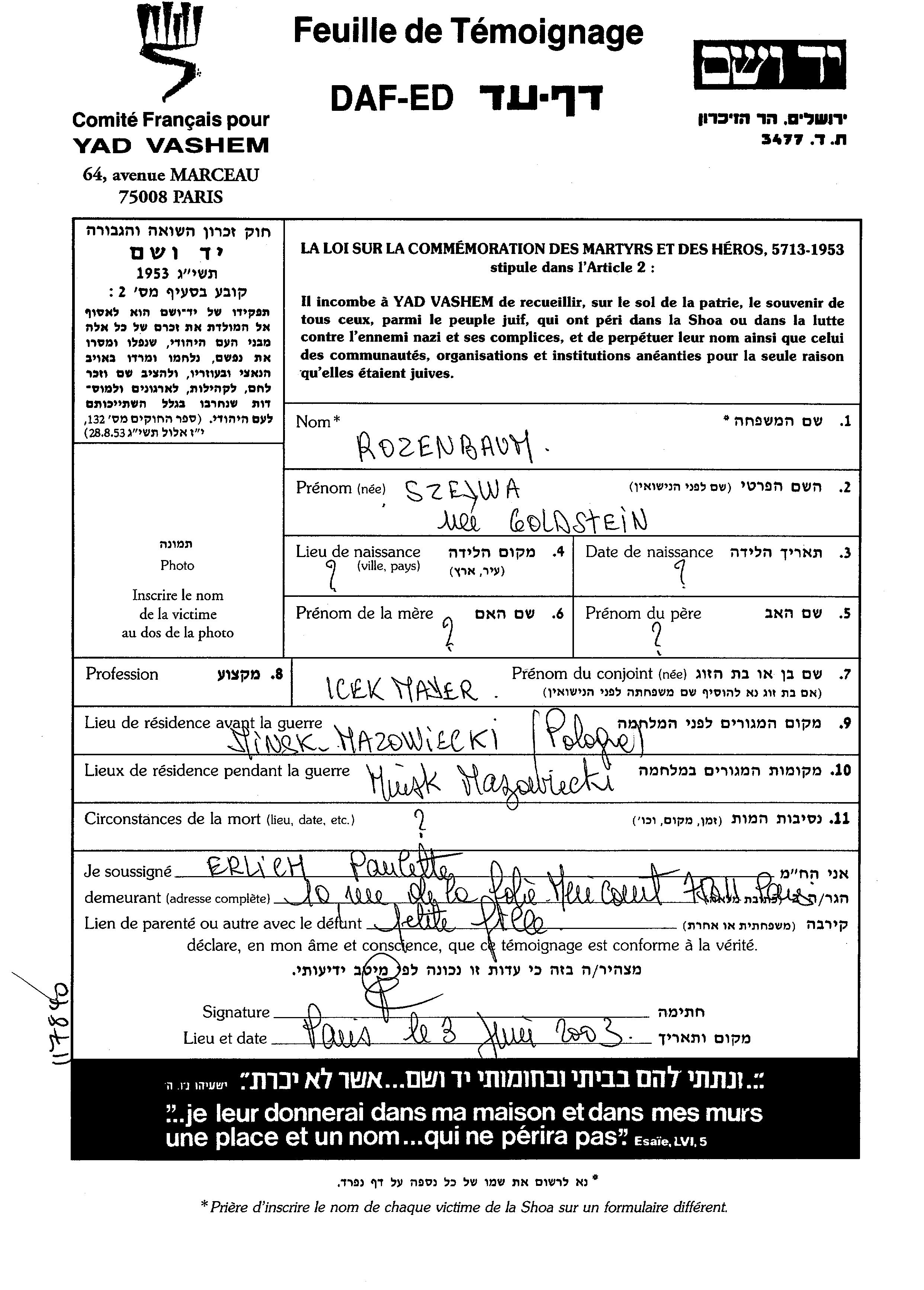 Rozenbaum Szejwa Minsk Mazowiecki, Polen Gedenkblatt