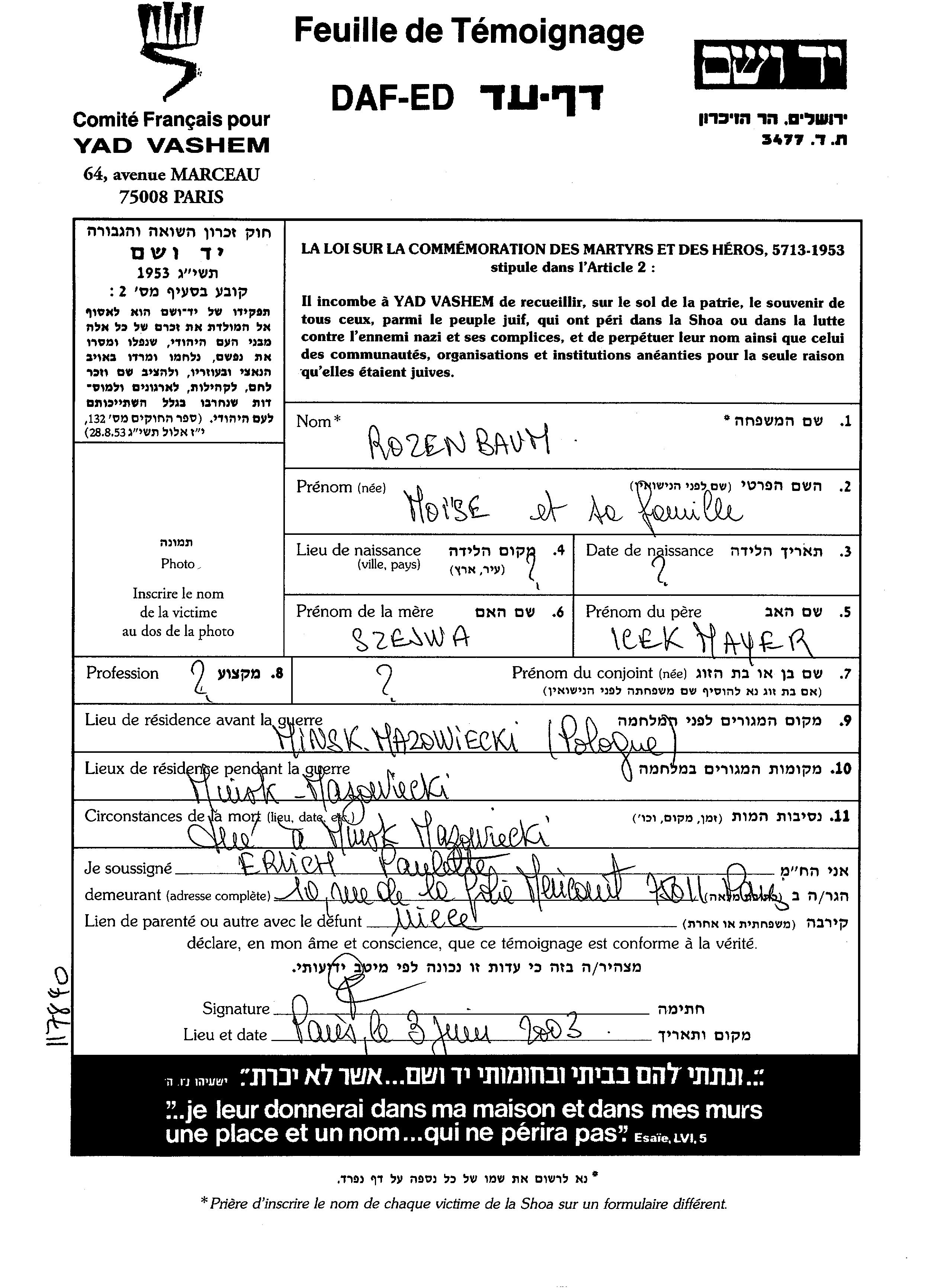 Moise Rozenbaum wurde Er war der Sohn von Icek Mayer und Szewa. Vor dem Zweiten Weltkrieg lebte er in Minsk Mazowiecki, Polen. Während des Krieges war er in Minsk Mazowiecki, Polen.