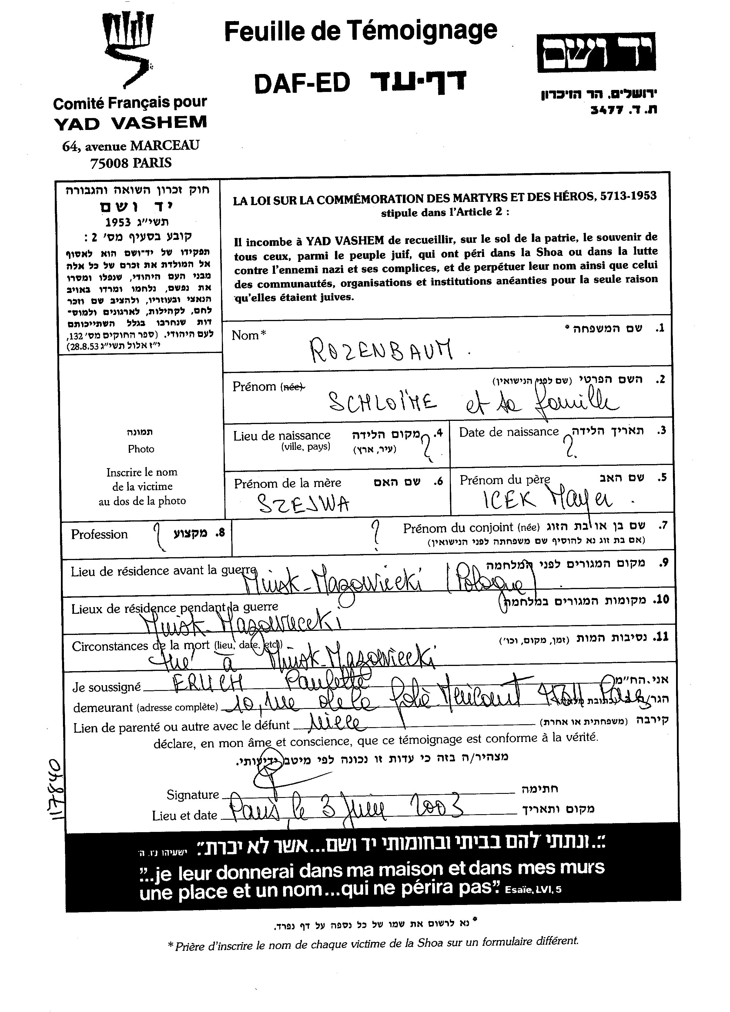 Schloime Rosenbaum wurde Er war der Sohn von Mayer Icek und Szejwa. Vor dem Zweiten Weltkrieg lebte er in Minsk Mazowiecki, Polen. Während des Krieges war er in Minsk Mazowiecki, Polen.