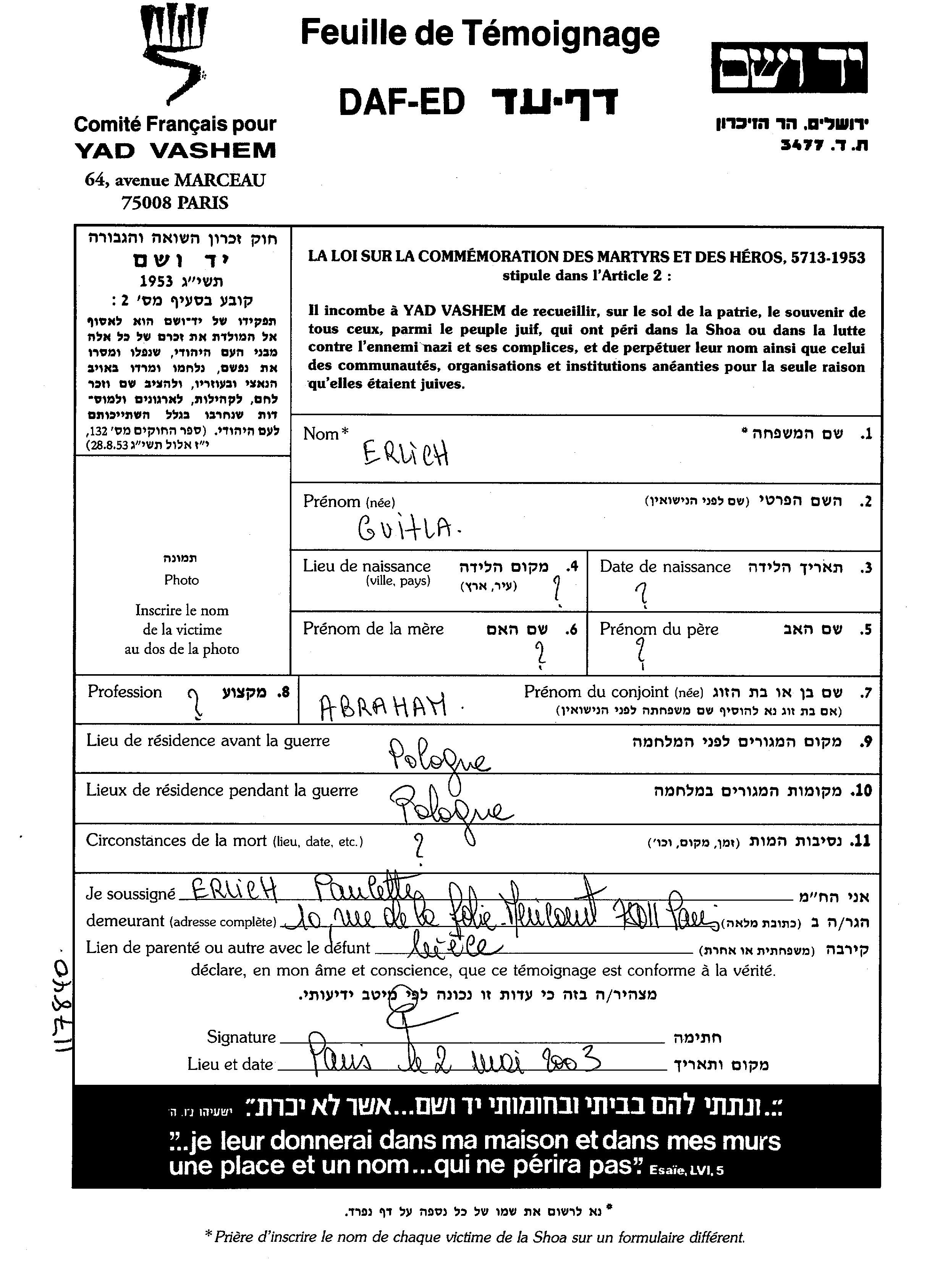 Guitla Erlich. Vor dem Zweiten Weltkrieg lebte sie in Polen. Während des Krieges war sie in Polen.