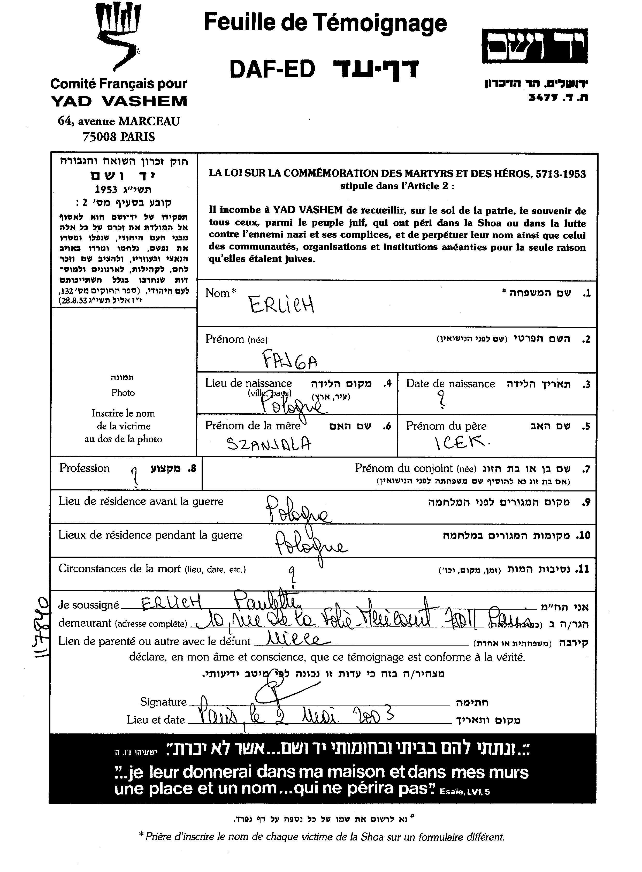 Fajga Erlich wurde in Polen geboren. Sie war die Tochter von Icek und Szajndla. Vor dem Zweiten Weltkrieg lebte sie in Polen. Während des Krieges war sie in Polen.