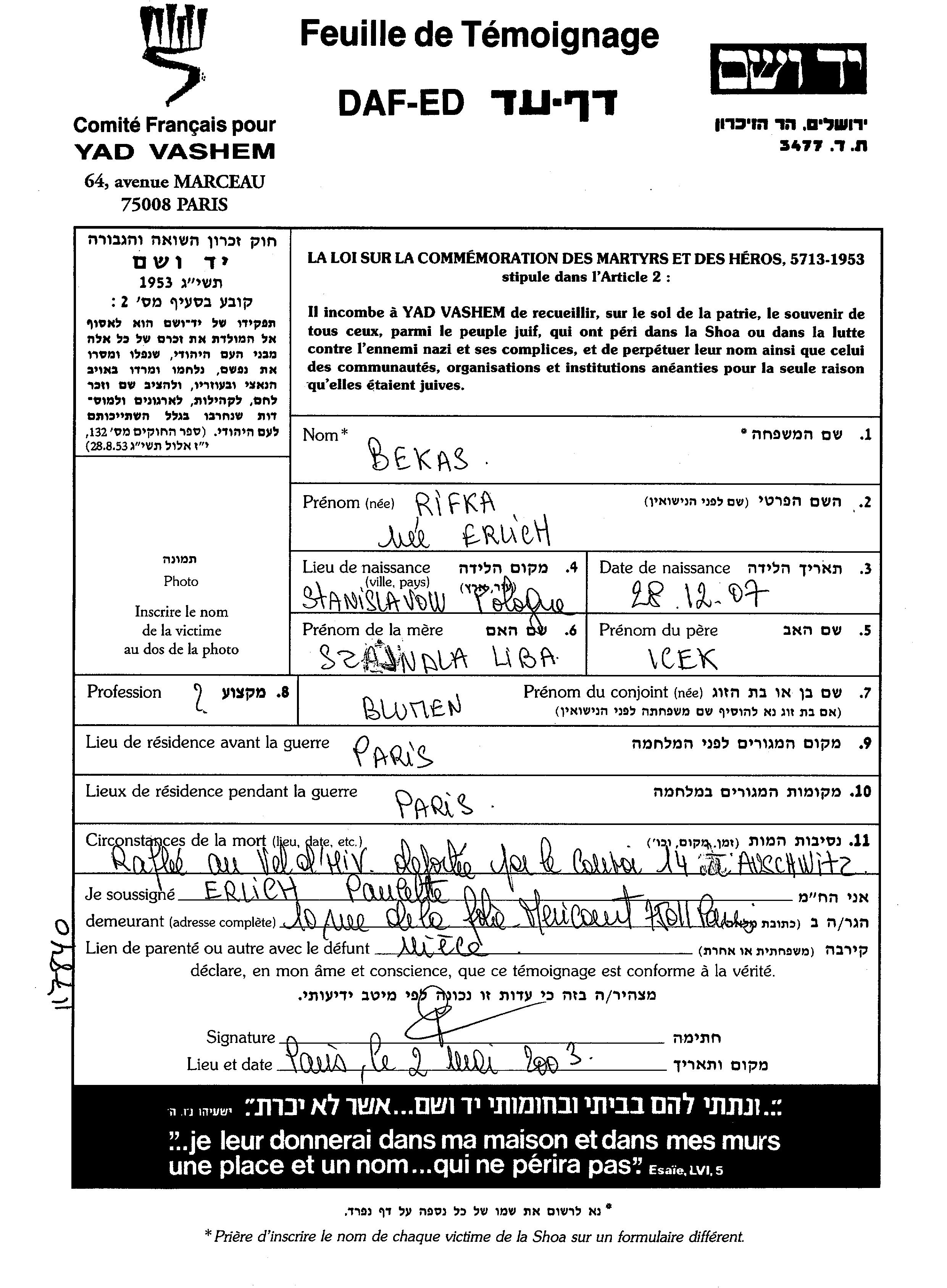 Rifka Bekas, geb. Erlich wurde im Jahr 1907 in Stanislawow, Polen geboren. Sie war die Tochter von Icek und Liba Szaindla. Sie war mit Bunem Verheiratet. Vor dem Zweiten Weltkrieg lebte sie in Paris, Frankreich. Während des Krieges war sie in Paris, Frankreich.