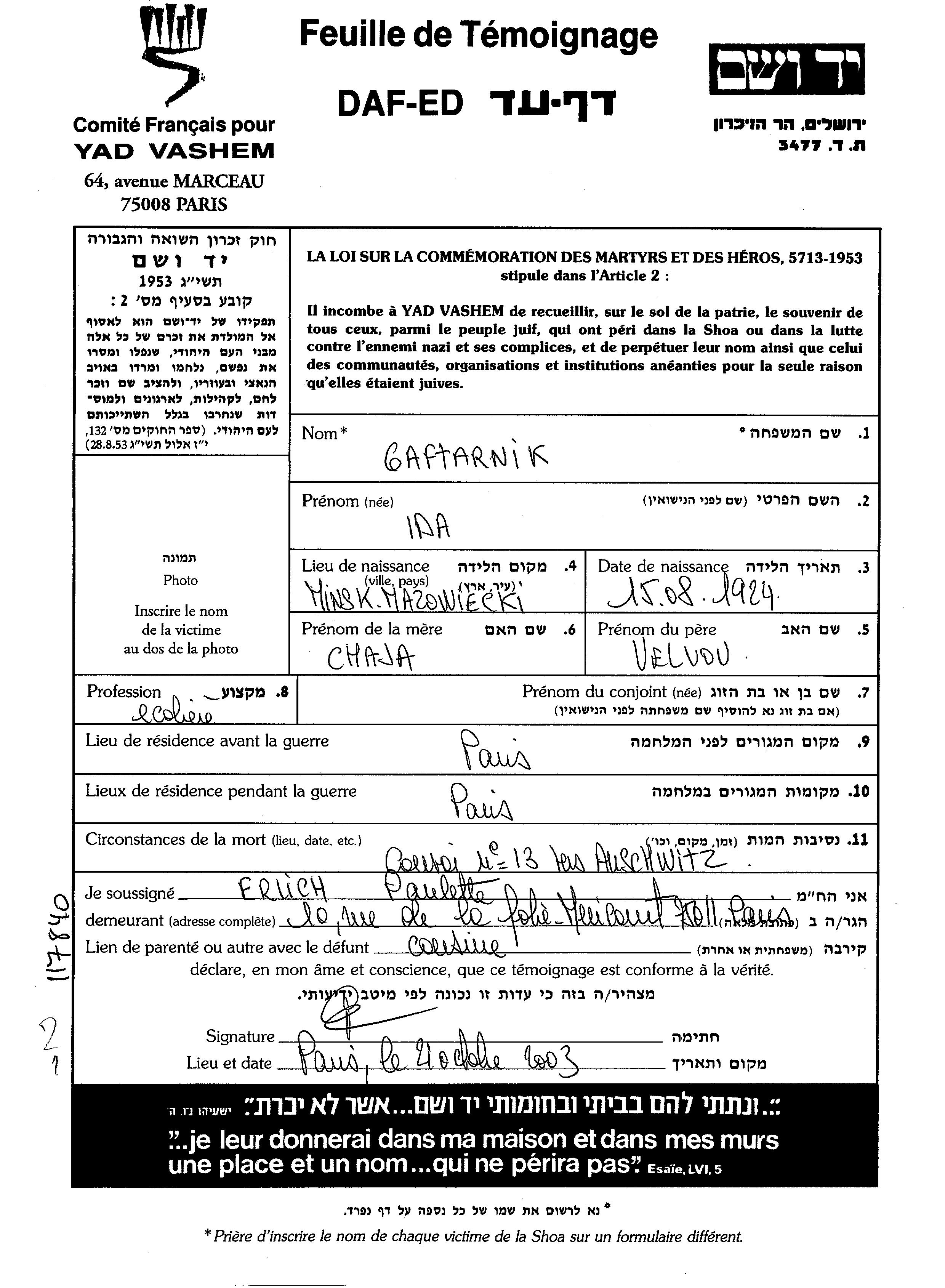Ida Gaftarnik wurde im Jahr 1924 in Minsk Mazowiecki, Polen geboren. Sie war die Tochter von Velvou und Chaja. Vor dem Zweiten Weltkrieg lebte sie in Paris, Frankreich. Während des Krieges war sie in Paris, Frankreich.